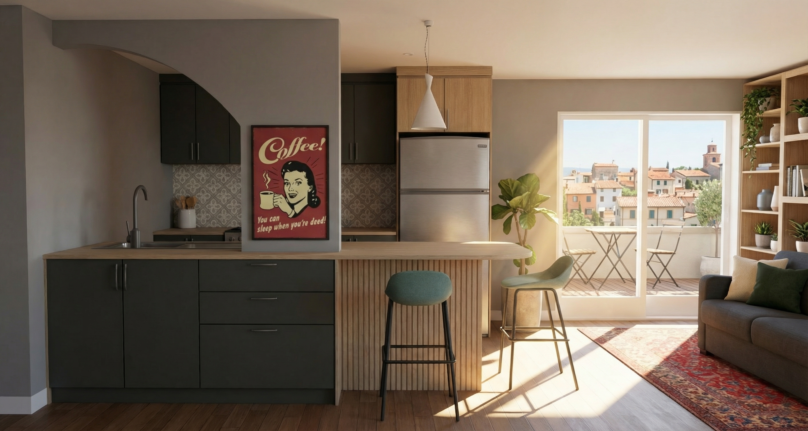 add some decorations to the empty shelves near the sofa two cushions on the sofa a terrace with a village behind the patio door and rays of sunlight inside maintain de same colors and textures precision