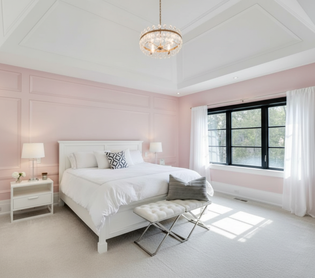 change the walls to a soft light lavender change the chandelier to champagne and crystal make the bed frame and nightstands white make the bedding light lavender and white