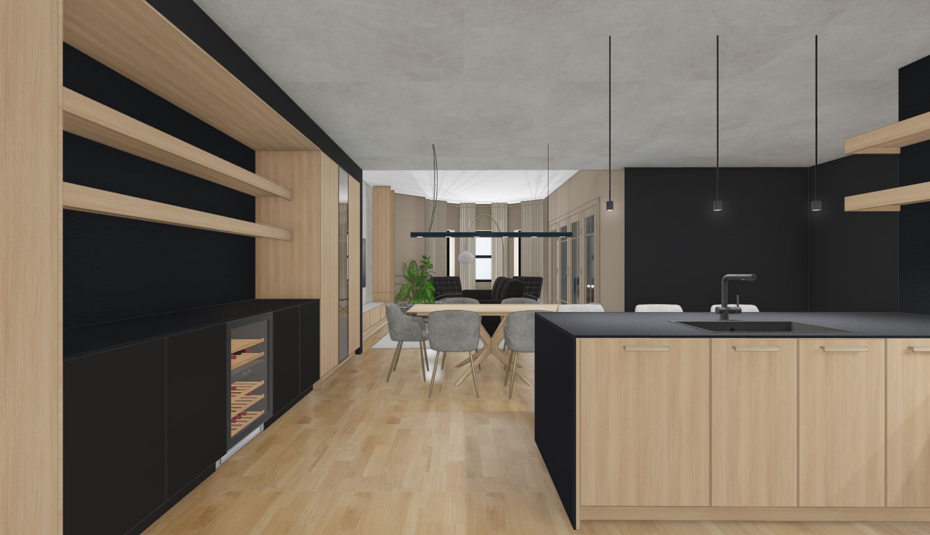 moody light cabinets in matte natural oak flat doors do not change cabinets nor add open shelves don t add new cabinets don t add new windows cloudy weather light inside wall glass cabinet glass door is semi mirror bronze glass room filled with ambient light ceiling matte light inside the tall cabinet with shelves and under the floating cabinets light under the shelves