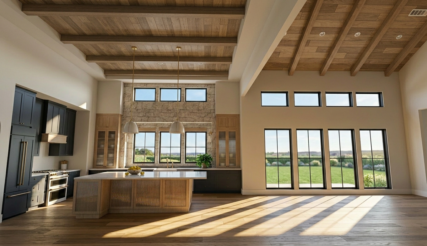 render realistically add led lighting under the upper cabinets and shelf where the glass cabinets are on the base cabinets please make these curtains with a pinstripe pattern the cabients should be a plum paint finish the plum paint will be more muted take off led lighting on the shelving to the right make the led lighting above the countertop less bright make door a wood door and remove diagonal lines the shelves on the right should be a dark wood to match the shelf above the countertop deep the color of the cabinets slightly make the backsplash more purple walls are a light cream trim is white remove the glass doors in front of the curtains so there is only a curtain remove the led lighting above the wood detail wall and head mount
