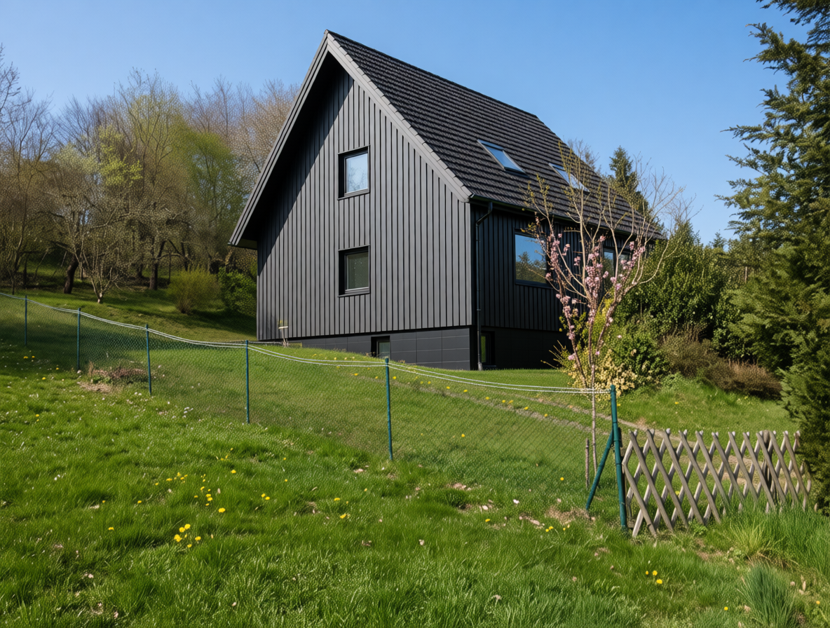 exterior shot mountain modern vertical dark siding with black window frames and property with a lush dense forest of tall mixed evergreens and hardwoods place