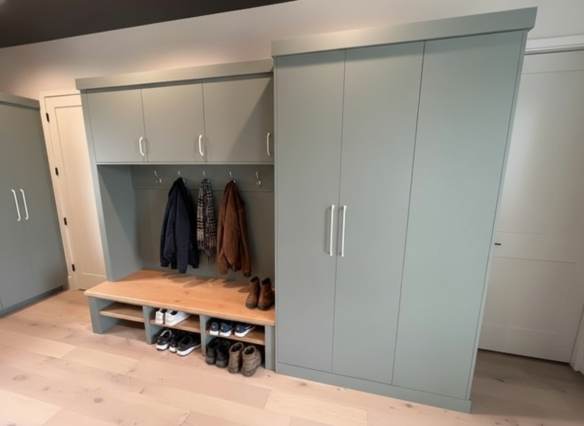 add hooks with coats hanging below the uppers add shoes in the open cubbies add tile to the floor and stage the open shelving for modern minimal mudroom decor clean the dust off of the upper cabinet on the right