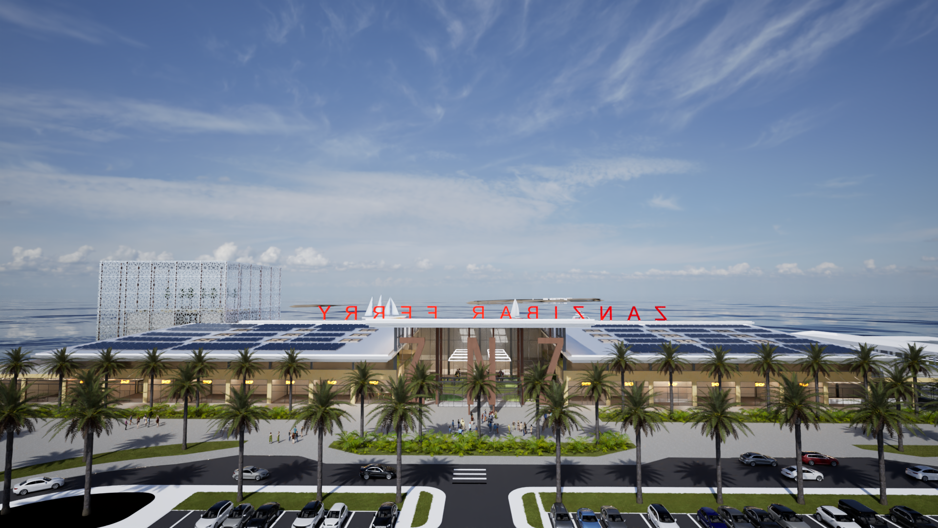 render a modern ferry terminal with a spacious design featuring a striking entrance the roof is adorned with solar panels in deep navy blue while the building exterior showcases sleek metallic and light beige tones surrounding the terminal are lush palm trees with vibrant green leaves and light brown trunks the parking area is filled with a variety of vehicles in black white and red above a clear sky with soft wispy white clouds creates a bright and inviting atmosphere the ocean in the background reflects a serene blue enhancing the coastal vibe add a sense of bustling activity with small figures of people entering and leaving the terminal the atmosphere is lively and futuristic emphasizing sustainability and travel