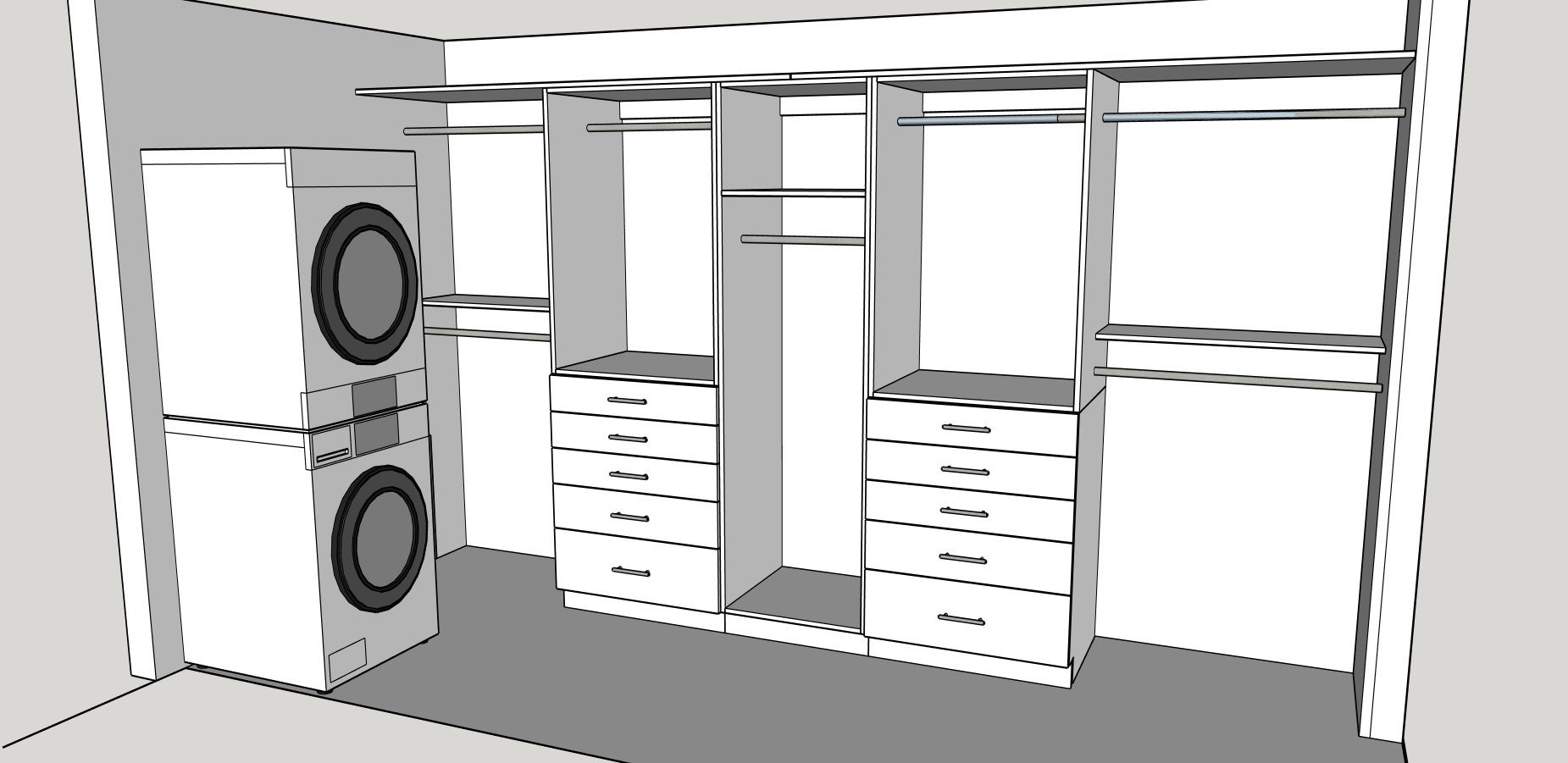 make a photo realistic image of this sketchup drawing it should be very life like and look like a dream closet from a design magazine add hanging clothes to the closet rods and add some shoes and accessories to the shelves