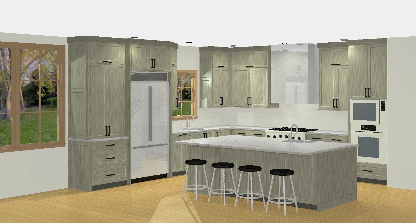 make cabinet wood grain rift sawn white oak with light gray stain color make flooring plank rustic white oak with medium brown stain make view out windows rocky mountains add under cabinet lighting