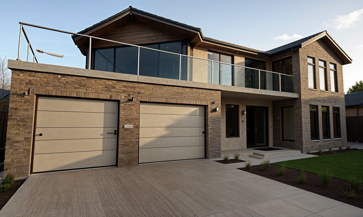 light exposed aggregate driveway with green manicured lawn and tropical plants coastal theme