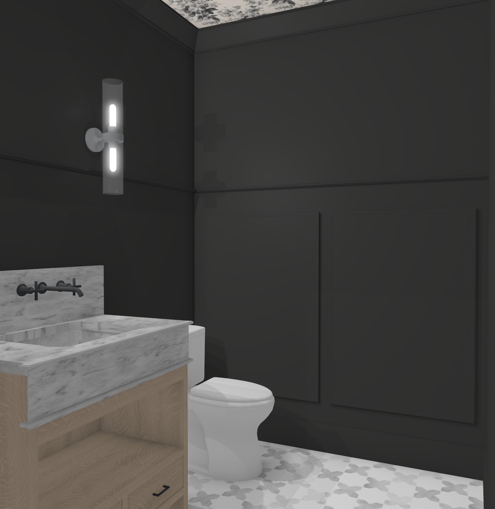 make this image a photogrpah of a moody powder bathroom make the apron front marble countertop wrap around the side of the vanity add some rolled towels under the vanity and stage as a bathroom