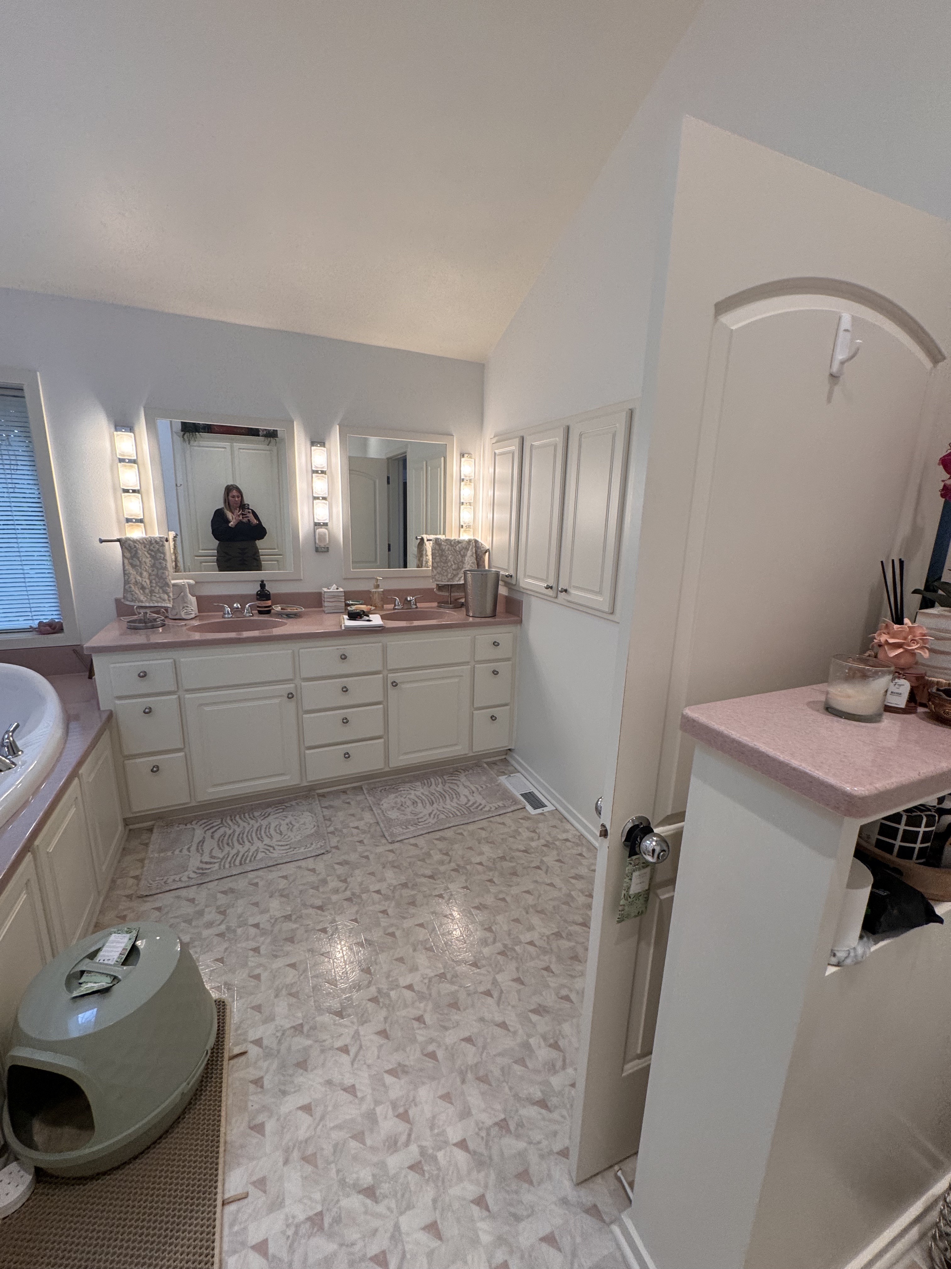 keep counter top pink change flooring change lighting fixtures change all hard ware to brass de clutter paint walls paint cabinets dark rich emerald green