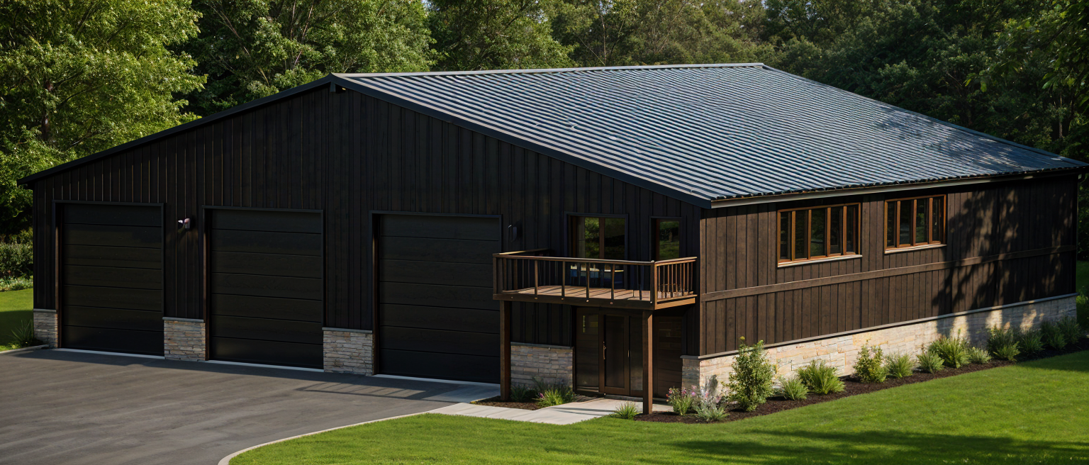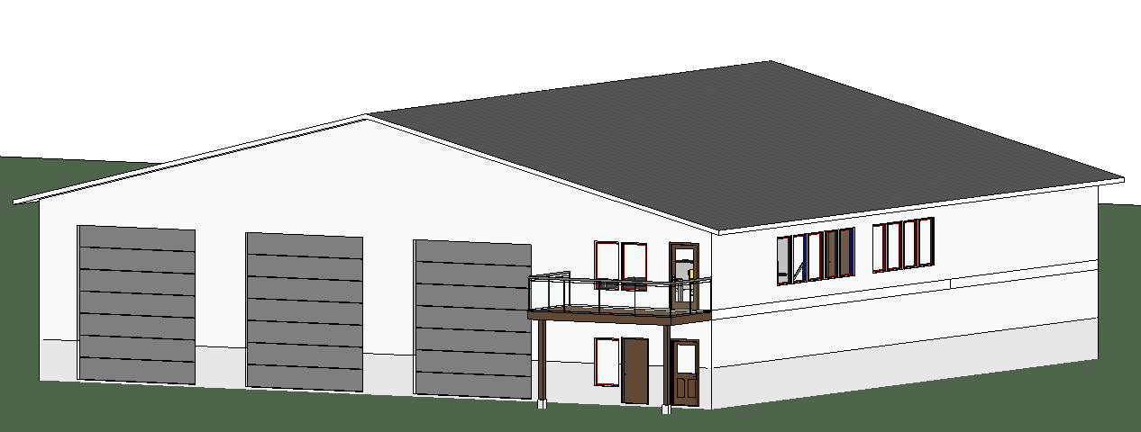 make look realistic use natural lighting make day time add landscaping with plants shrubs flowers and surrounding trees make the roof have large metal panels the siding on the building is light grey thick metal vertical panels add a large driveway to all three garage doors coming straight from the left side make the siding dark grey vertical metal panels make sure both posts for the deck stay attach the slab under the deck to the driveway add sunshine onto the garage doors