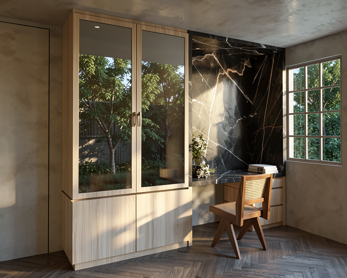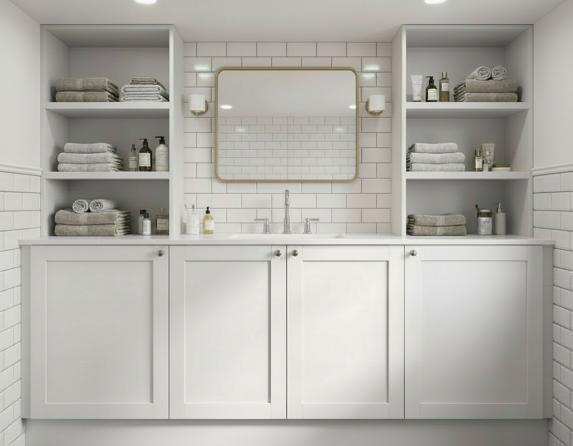 change the mirror above the vanity to be a brushed nickel framed mirror leave all other details the same