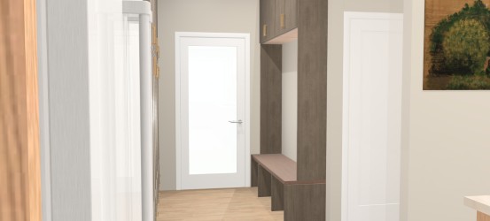 stage this entryway with a neutral patterned runner and neutral patterned pillows on the bench leave cabinetry the same and door