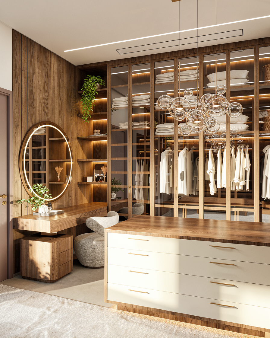 render this elevation of a foyer entry for a european modern coastal house the walls are light oak wood and fluted there is a hidden door that is also fluted remove the doorknow the built in bench has storage and a deep green suede cushion on top have the lighting be bright daytime and make as realistic as possible everything on the wall is in line dont add any decor in front of the bench make bright and airy
