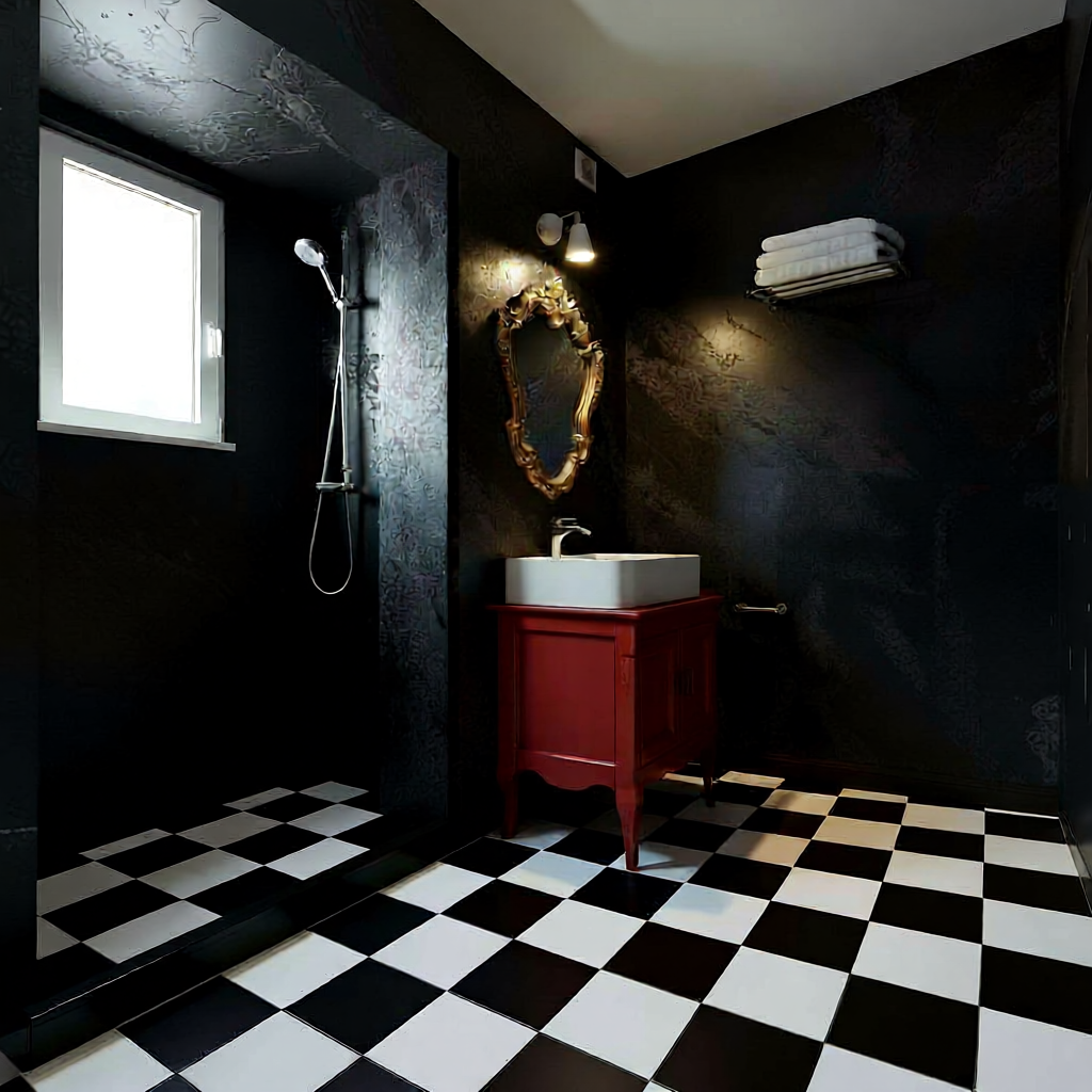 a frontal view of the wall with the shower and the side of the red cabinet and the sink all objects remain in the same place only the viewing angle is rotated by 45 degrees