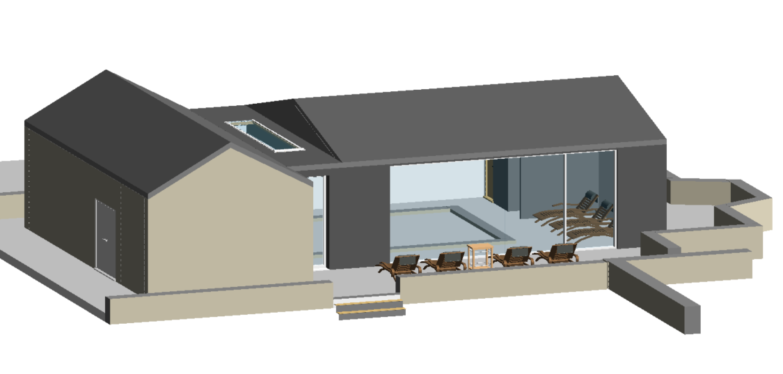 a pool house set in the english countryside on a spring day