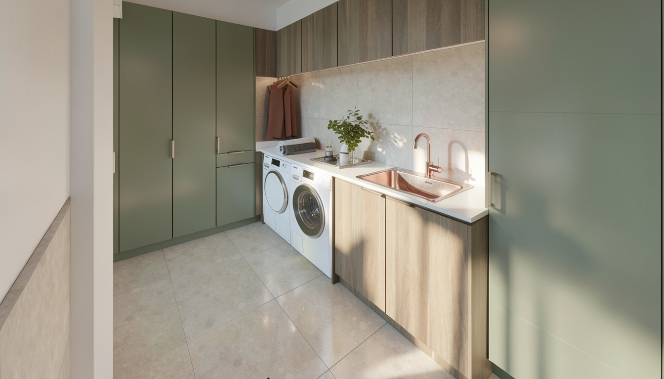 render it as real with good lighting dont change anything else in the render keep everything where currently is the tapware mixer is rose gold the basin in brushed nickel dont add ligthts under hanger and panel of cabinetry are flat no lines