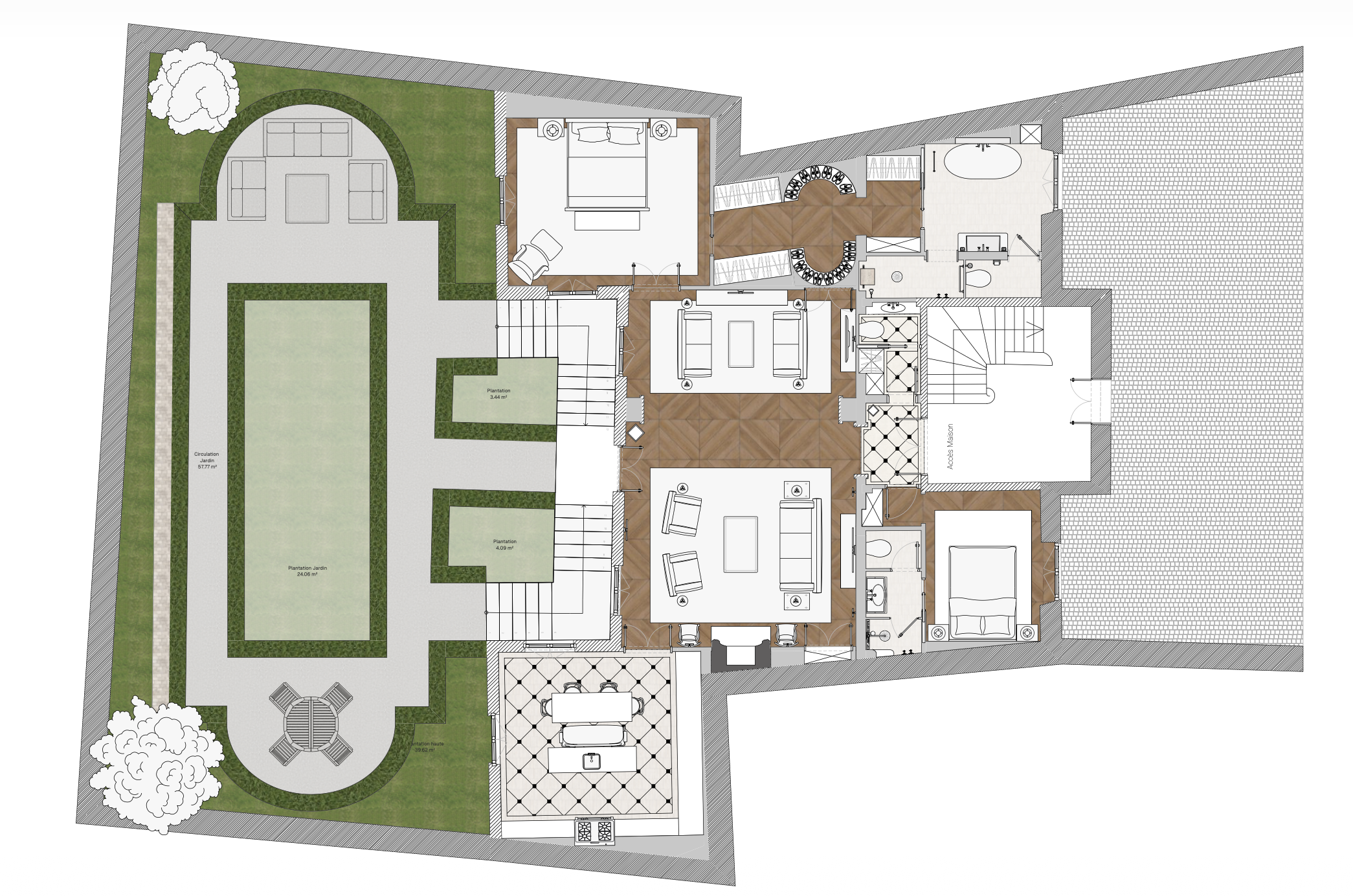 convert this floor plan into a realistic isometric 3d view of a full house show the space from an elevated angle with furniture walls and details visible use the same furniture as shows on the plan do not change the orientation of the floorplan