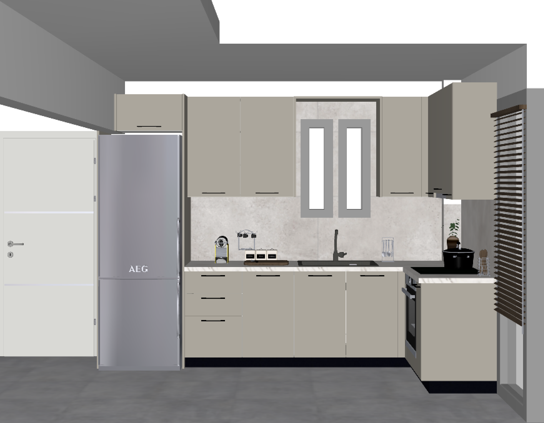 create a cozy and modern kitchen dining area with soft warm lighting use a light grey color for the walls to provide a neutral backdrop the ceiling should be a darker grey to add depth incorporate a sleek stainless steel refrigerator with a reflective surface the cabinets should be a light beige color complementing the white marble countertop with subtle gray veins design the dining chairs with pale ivory upholstery and dark walnut brown wooden legs and frames the floor should be a medium grey tile adding texture and contrast include minimalistic black accents like the faucet and cabinet handles to enhance the elegant atmosphere