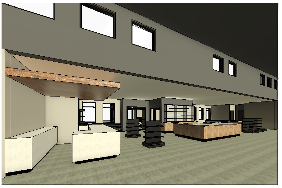liquor store with polished concrete floors black exposed steel structure ceilings neon beer signs people shopping liquor bottles on shelves