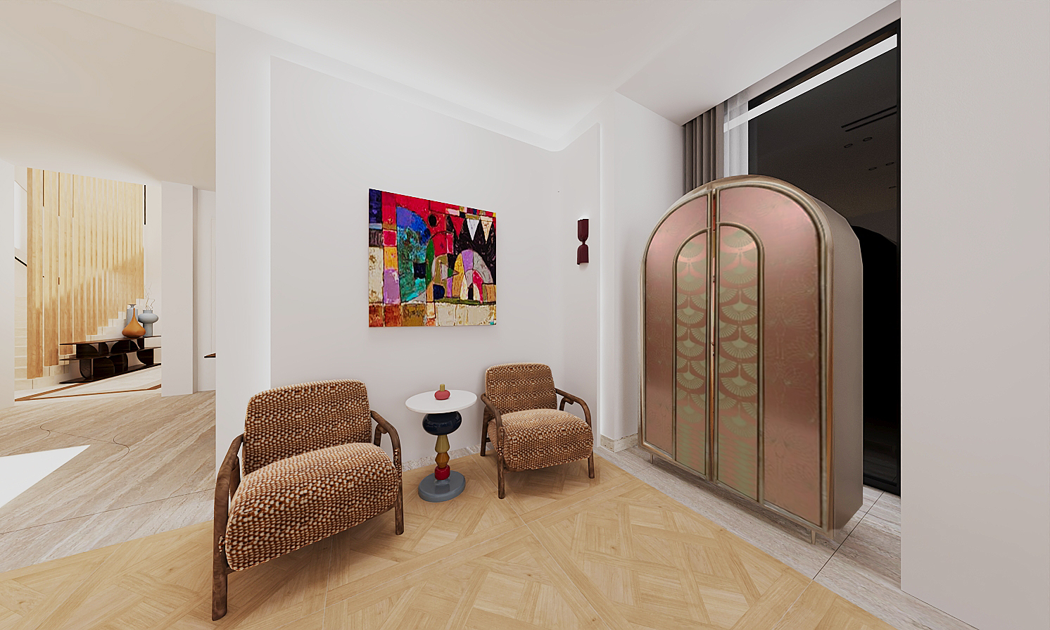 lighting to be daylight but not sunset the cabinet has a mirror reflective surface but same color and outside the window we should see a boundary wall of the outside of the villa minimal plants in planters