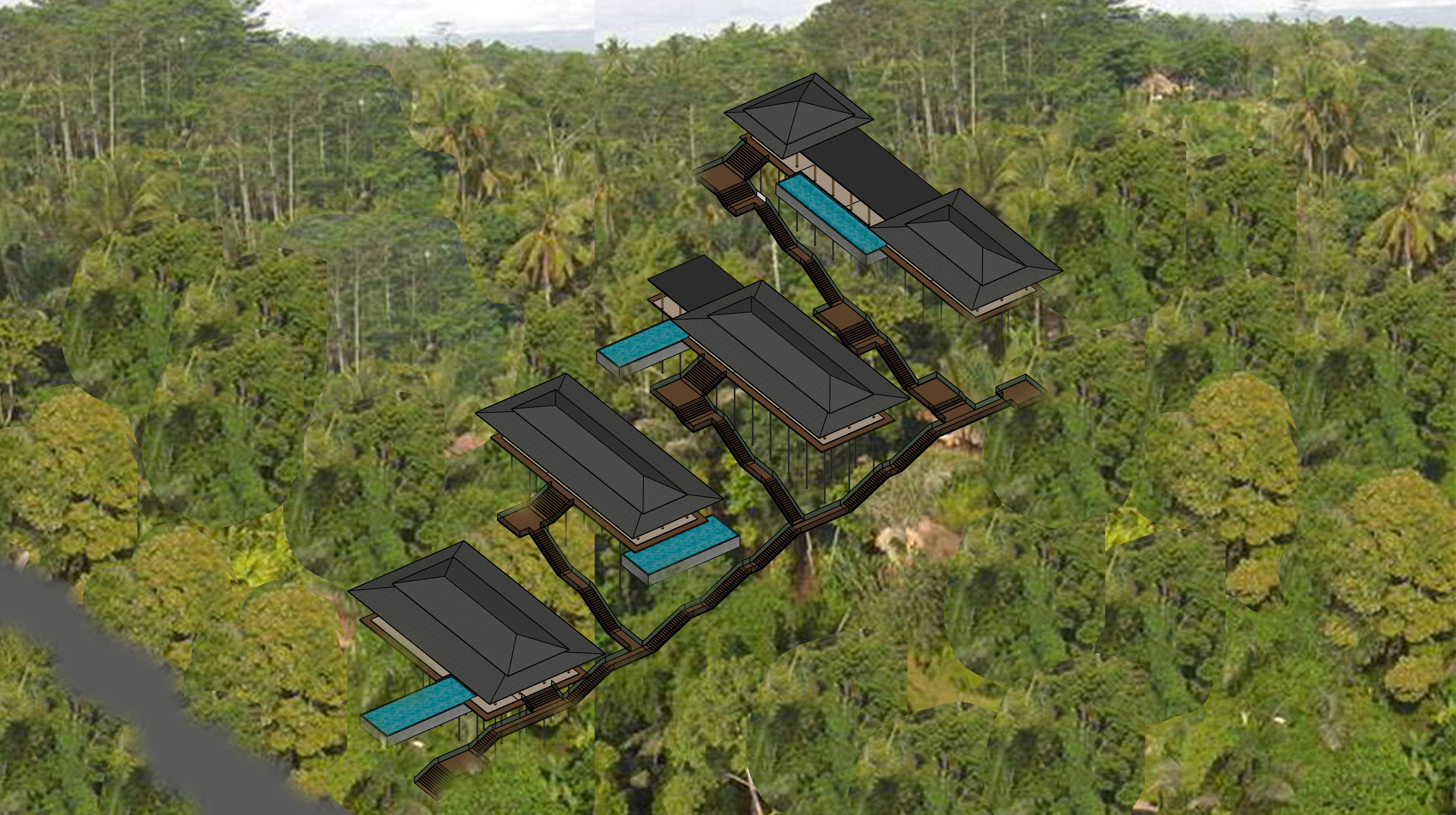 render the existing 3d drawing from an aerial angle looking slightly downward at the villa do not change any elements of the model only adjust the angle enhance the luxury japanese style architecture with wood columns dark roof and minimalist modern expression show the villa elevated on stilts floating above the coastal hillside dry forest preserve the ambience sea visible far back small road and pedestrian zone in the lower foreground and dense tropical vegetation on the upper hill behind