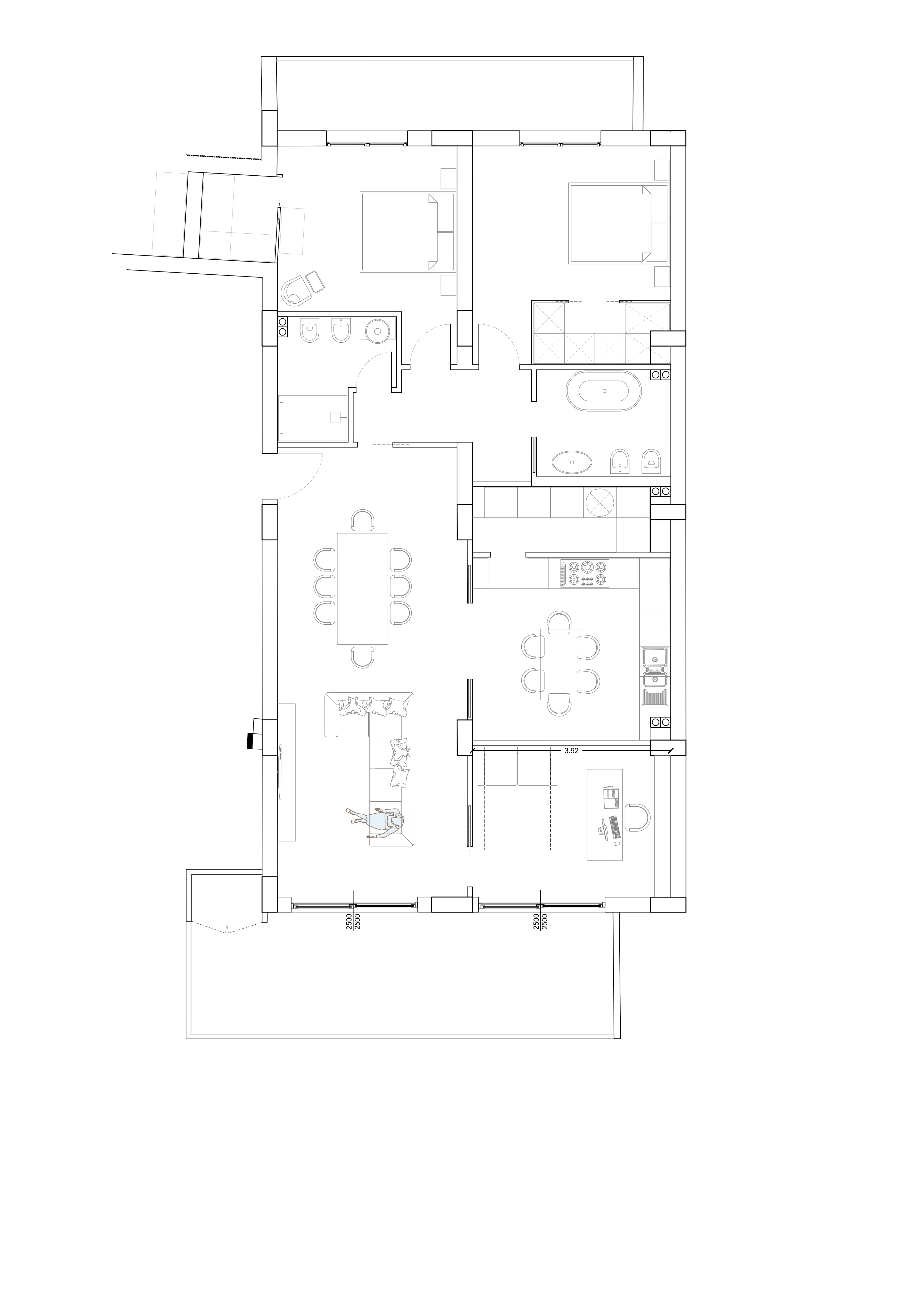 convert this floor plan into a realistic isometric 3d view of a full house show the space from an elevated angle with furniture walls and details visible stile moderno colori neutri use the same furniture as shows on the plan do not change the orientation of the floorplan
