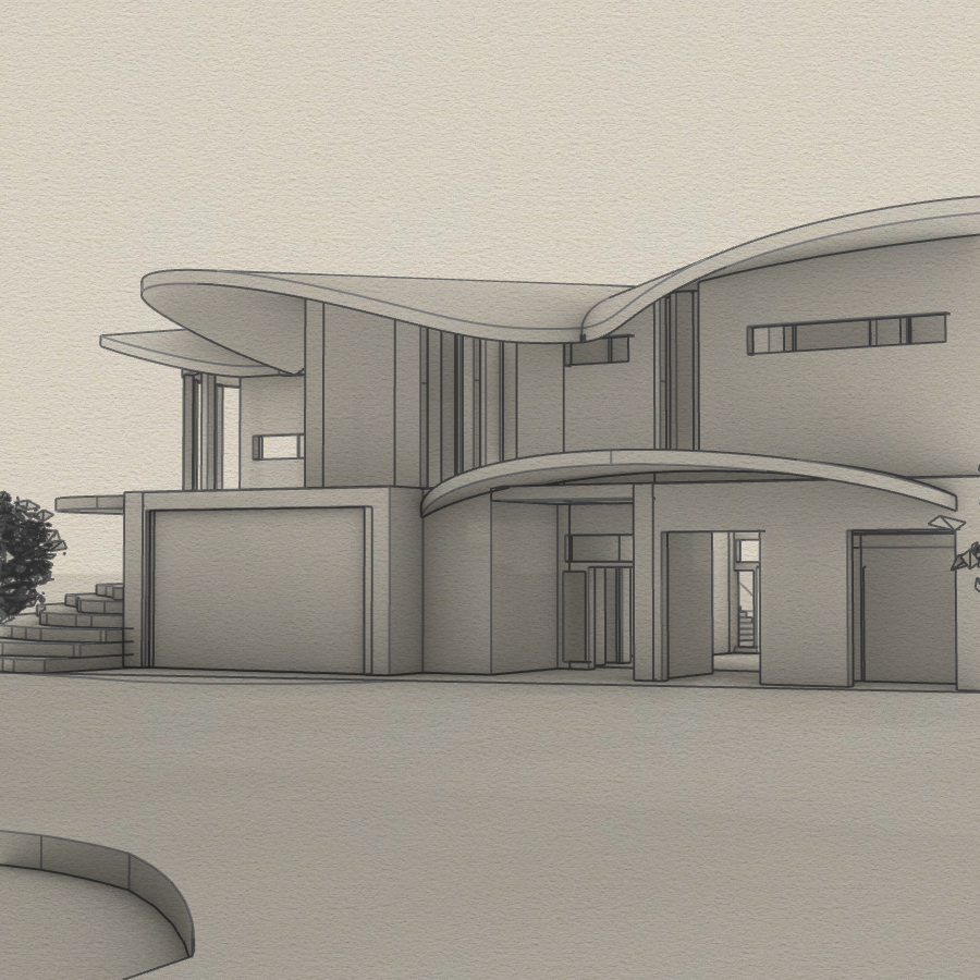 architectural watercolor rendering of exteeior view looking towards front of research facility in a forest environemnt looking at towards building entrance with paths leading up to it nothing but blue sky and clouds in background realistic materials background and edges dissolve into loose watercolor washes and white paper edges not full bleed with soft unfinished fade around the image visible pencil and ink linework with light technical annotations artistic yet grounded balance of precision and painterly abstraction calm morning light concept architectural visualization style