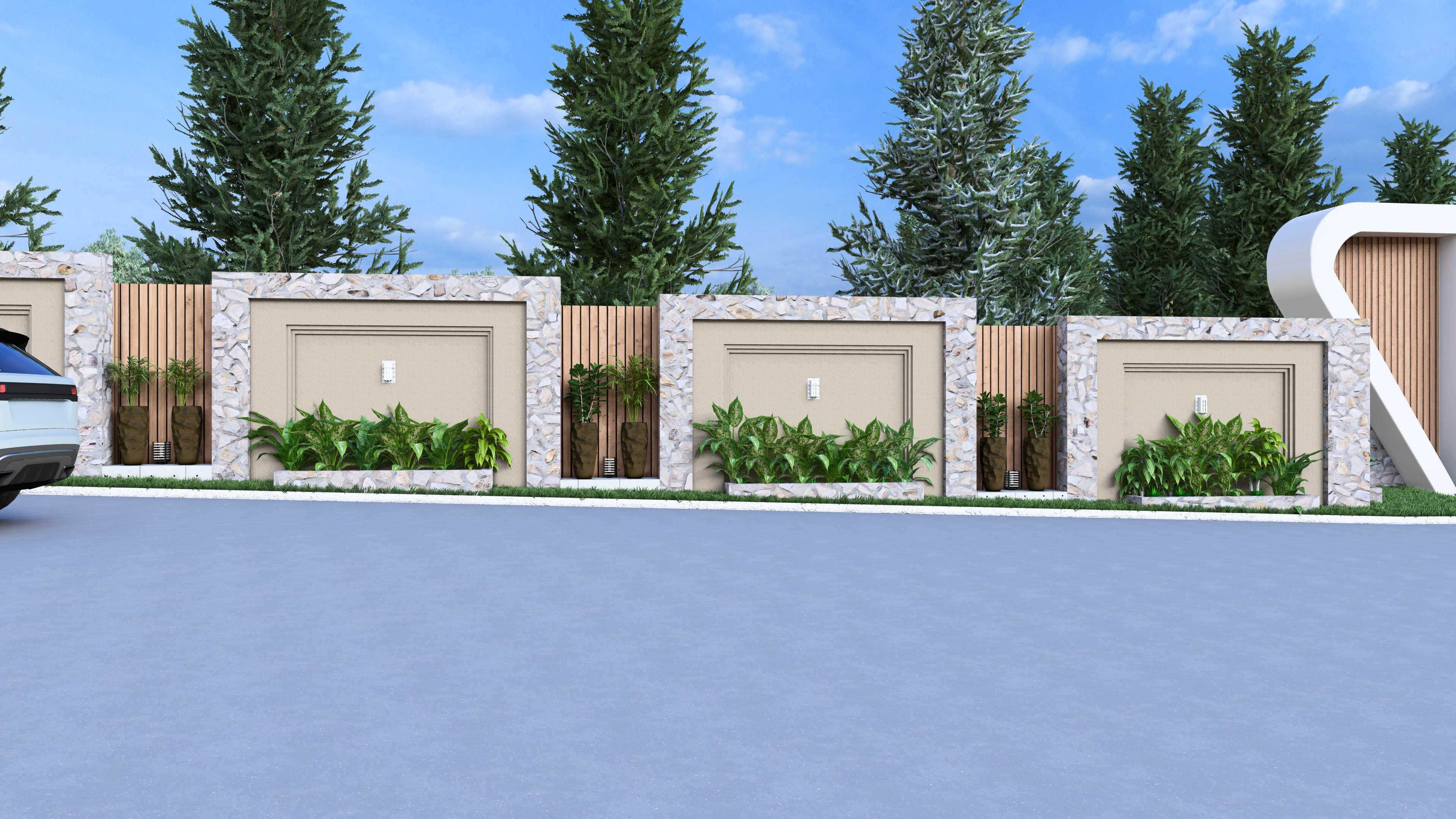this is a boundary wall with different textures potted plants in the nooks and planters as well enhance the details make them stand out the tarmac should have new tarmac appearance i e rough and dark gray colour