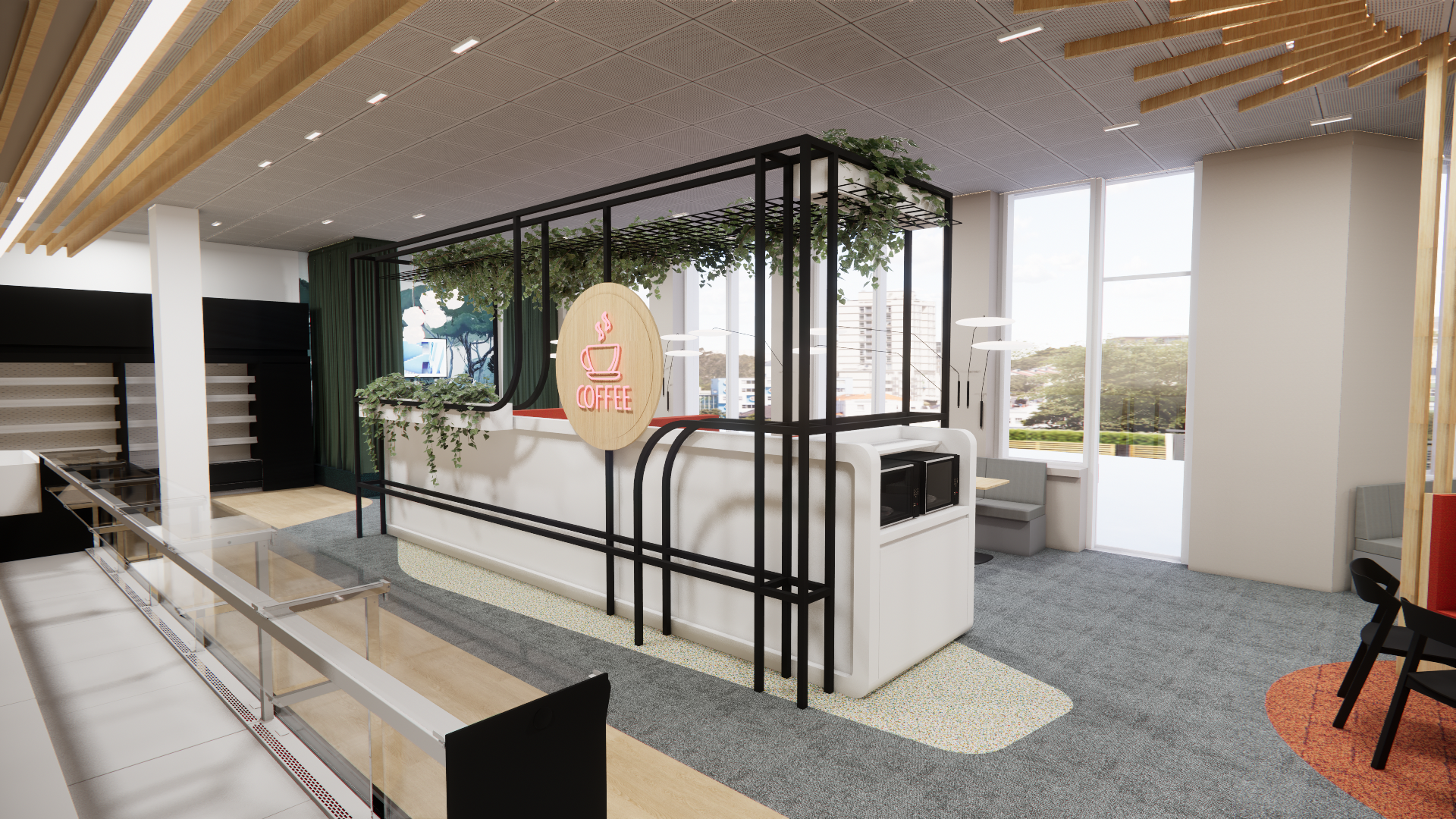 natural light true the large windows its an relaxed coffee corner area with you people laughing and connecting