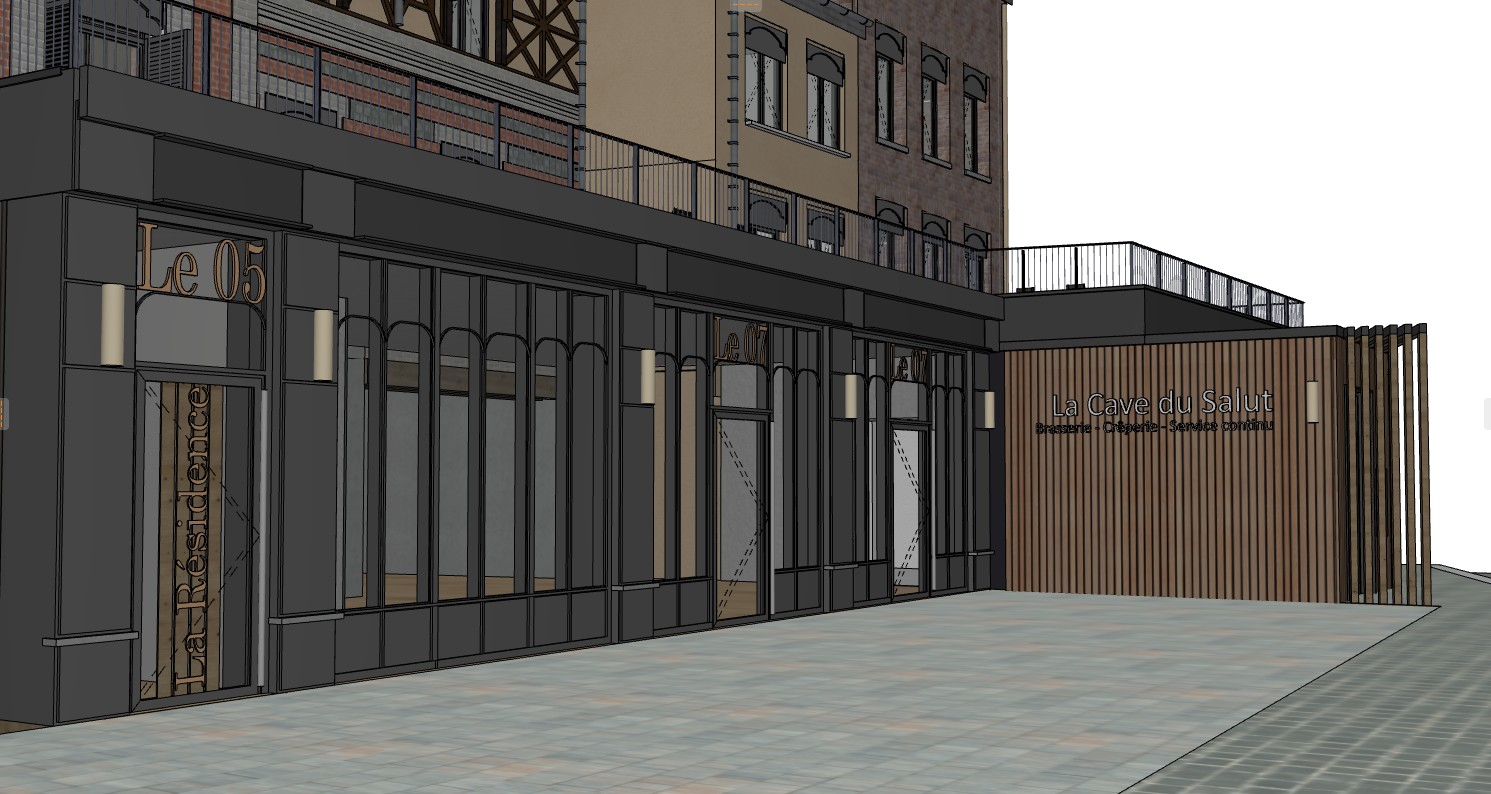ultra photorealistic architectural rendering strictly preserve original geometry volumes proportions fa ade composition materials and all architectural elements no modification no redesign no reinterpretation time of day late afternoon 5 00 pm lighting warm natural sunlight with a soft golden tone sun at medium low angle sky clear light blue sky slightly warm near horizon very subtle gradient minimal soft clouds shadows elongated soft slightly warm shadows consistent direction realistic depth int rieurs fen tres vivantes et anim es soft warm interior lighting turned on 3000k 3500k subtle and realistic slight variation of light intensity between windows avoid uniformity add very subtle life inside light silhouettes faint movement blur gentle luminance variation as if people moving or light flicker keep it minimal and elegant no clear characters no focus shift maintain partial transparency of glass with realistic reflections mat riaux enhance realism without altering original design brick nuanced tones slight weathering wood warm response to sunlight soft reflections metal subtle highlights slightly reflective glass balance between reflection sky surroundings and interior visibility sol contexte sidewalk softly warmed by sunlight slight long shadows across the ground crosswalk subtly integrated optional very light ambient street reflection dry surface cam ra eye level perspective 28 35mm lens vertical lines perfectly straight natural framing centered on fa ade render ultra high resolution global illumination ray tracing natural color grading high dynamic range crisp but realistic details