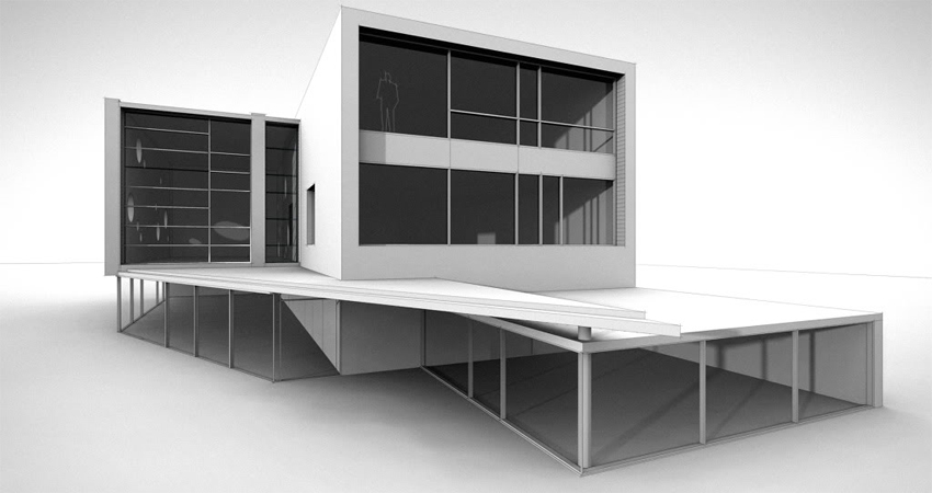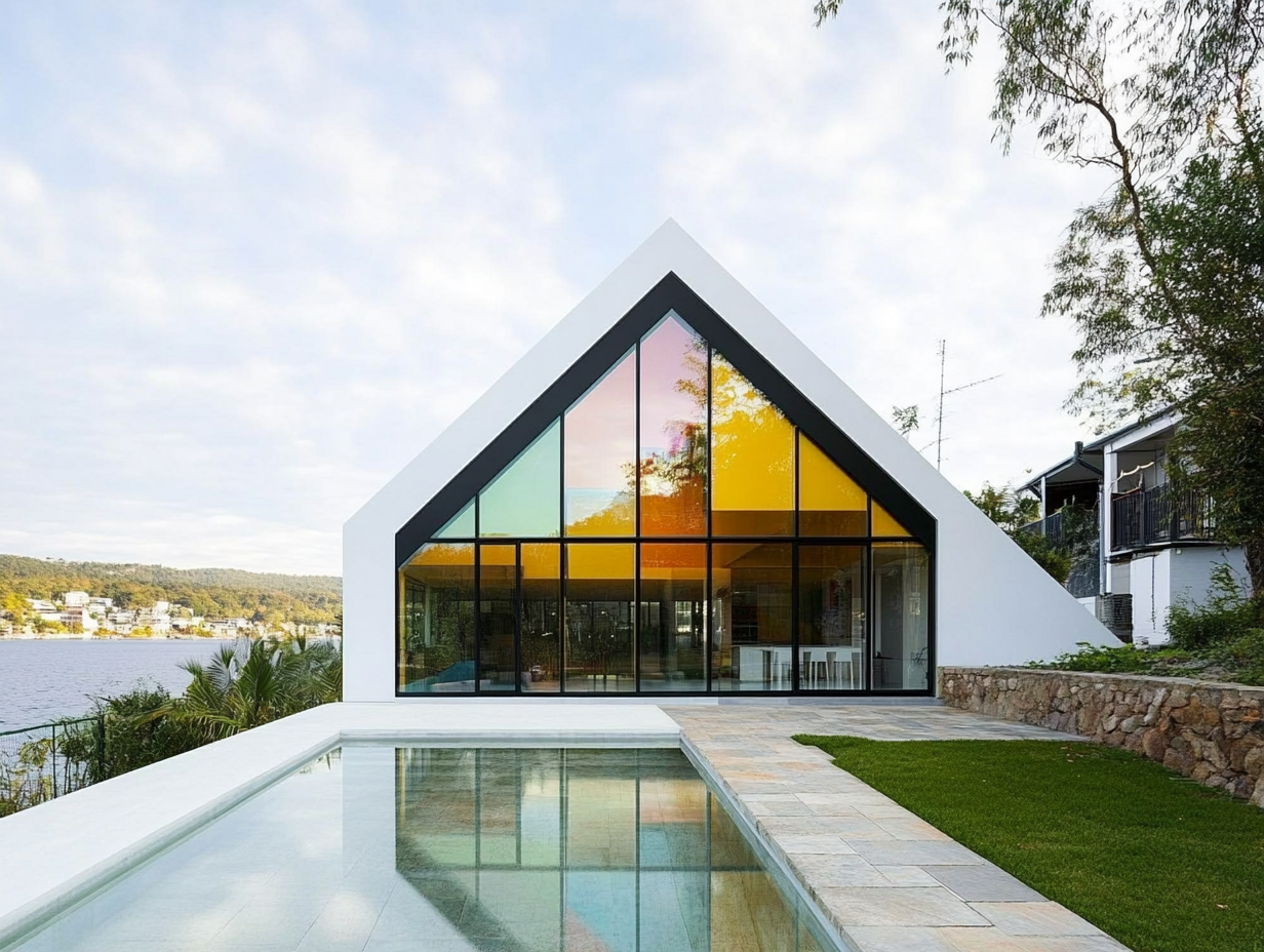 exterior shot modern minimalist house with sleek lines large glass windows and flat roofs pastel teal and light gray for the exterior walls paired with charcoal gray window frames the glass should reflect a serene sunset sky in warm hues of orange and pink casting a soft golden light on the building surround the structure with lush green lawns and a few scattered tall palm trees the overall ambiance should be calm and luxurious exuding a sense of modern elegance