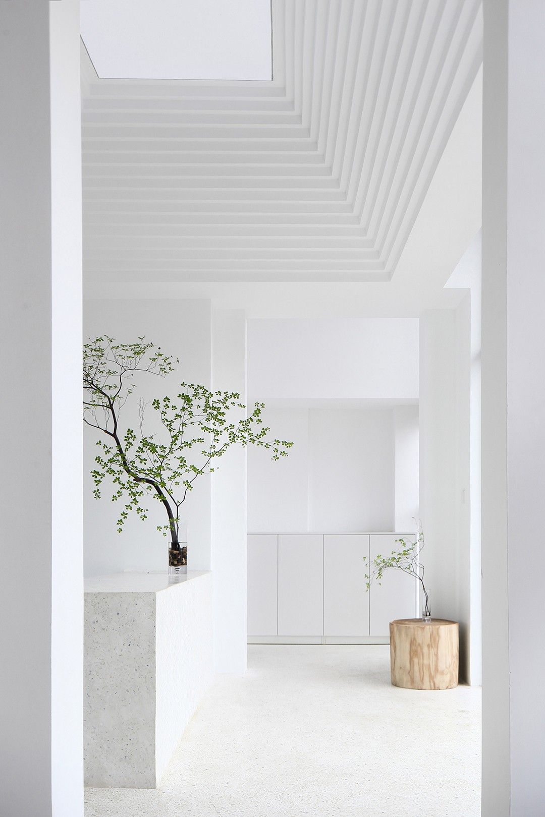 prairie style interior shot modern and clean style living some lights wood floor plaster walls design some decorative plants architecture