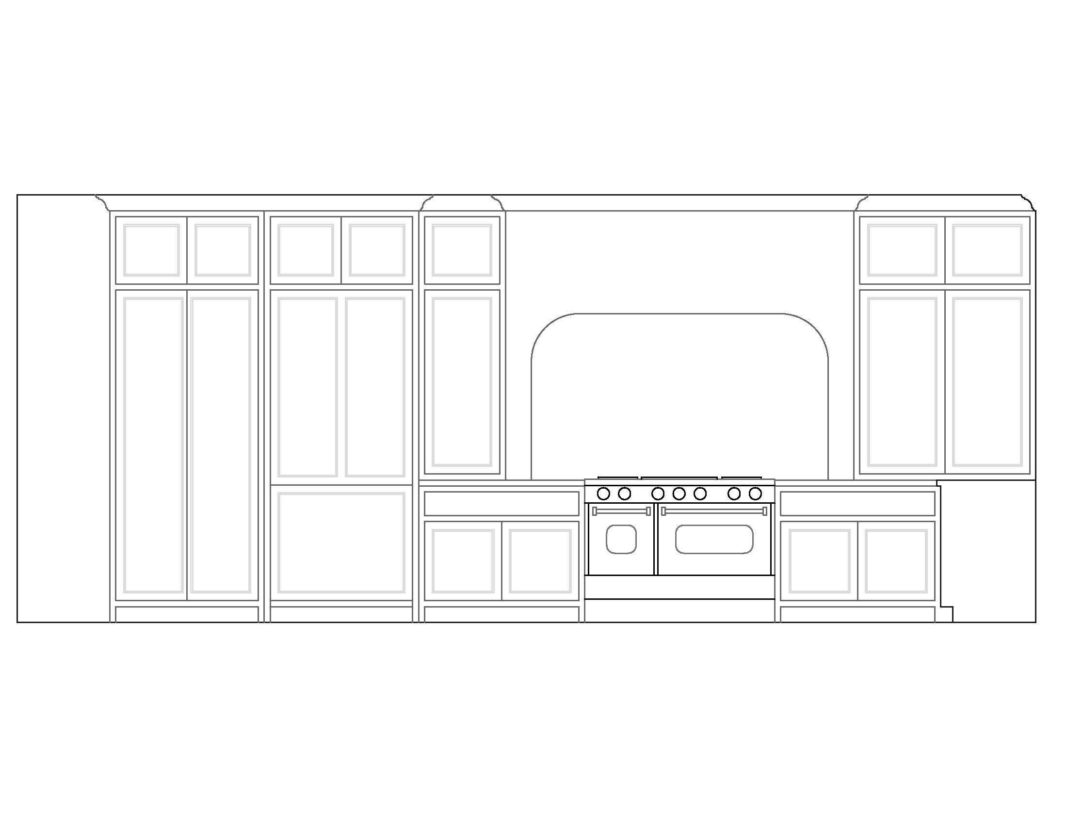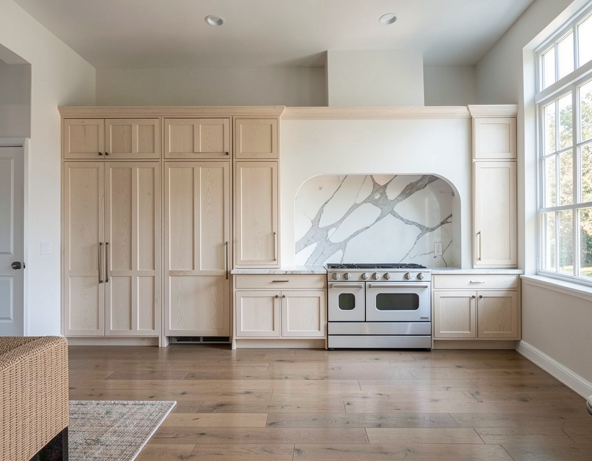 medium oak cabinets with white arch and marble backsplash