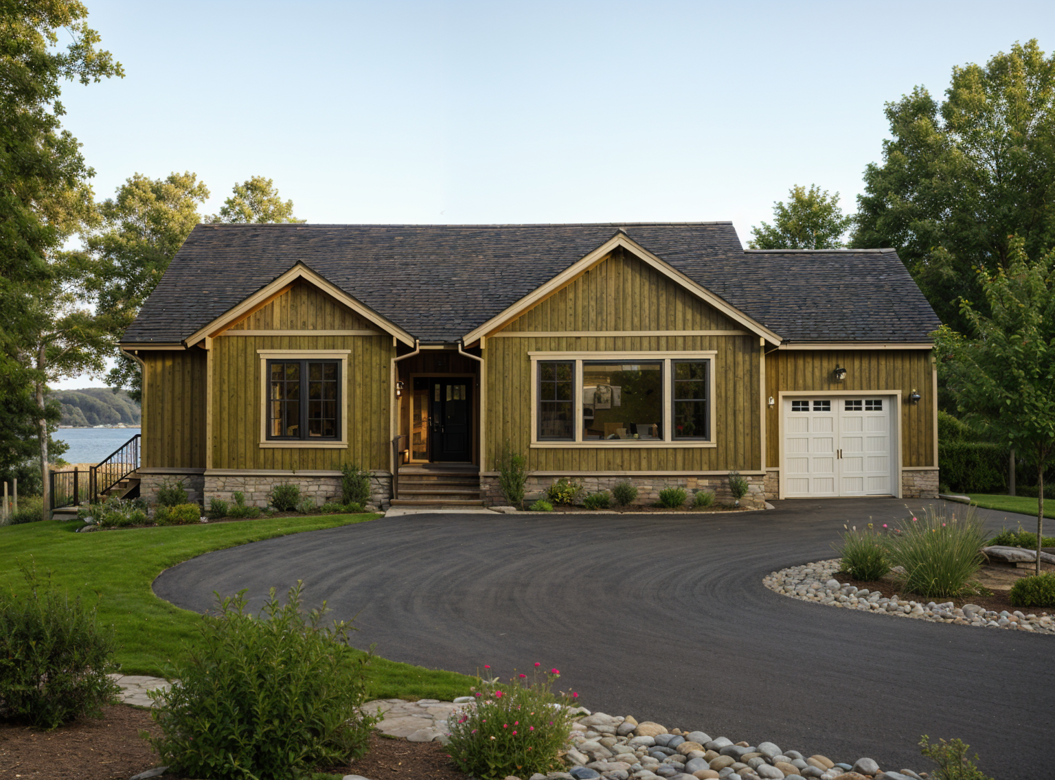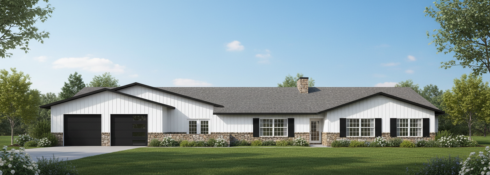 a modern ranch style structure with the following features 1 medium gray asphalt shingles 2 40 high river rock wainscot all along the front base of the house 3 the large window openings are a pair of white single hung windows with divided light top and bottom windows 4 black shutters on the sides of each window 5 white vertical board batten siding from the top of the stone up to the roof overhang 6 the existing front door is aligned in the same plane as the front windows to the left the door panel is black and has a 9 section divided light 7 the glazing to the right side of the garage is a pair of 36 wide white arcadia patio doors with divided lights 8 there will be a 3 high river rock faux rock wall panel courtyard wall extending 16 to the right side of the garage 9 the sectional garage doors will be black with a 3 long x 6 window on the right end of each panel 10 the existing chimney will have river rock that matches the house wainscot no other options allowed stay specifically with my instructions