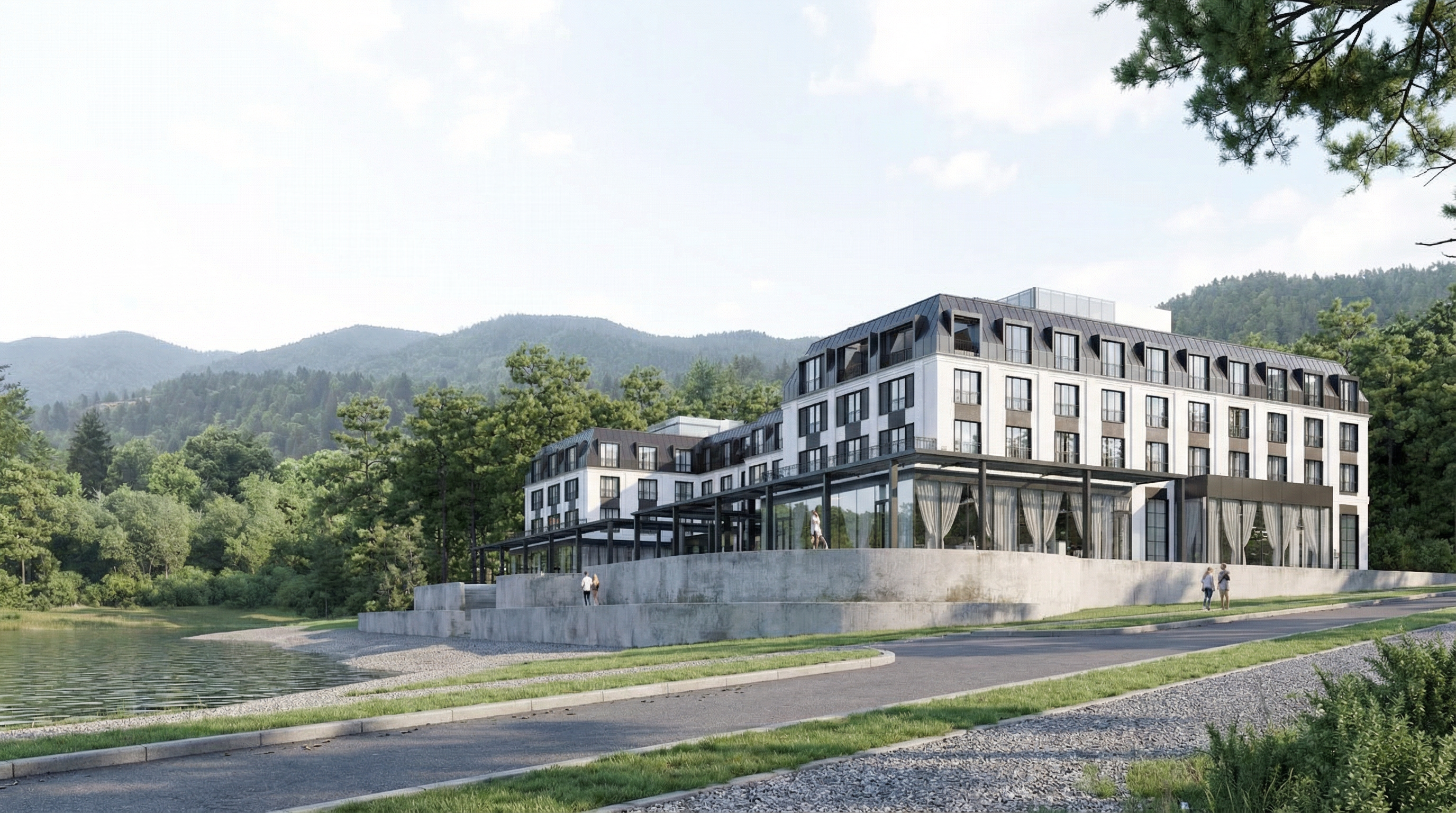 remove the sandy beach area in front of the hotel and delete all sunbeds umbrellas and beach furniture replace the entire beach zone with short dry looking grass that is less lush and less dense similar to semi arid or mediterranean grass the grass should be slightly patchy with some variation in color light green yellow green and beige tones but still realistic and well blended keep the hotel buildings pools palm trees sky lighting camera angle and architectural style exactly the same match shadows and perspective to the original scene and change nothing els