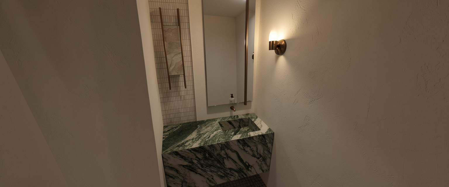 use exact input image do not change layout or camera convert to high detail photorealistic render accurate materials sharp textures neutral lighting walls matte plaster with visible texture vanity high contrast green marble sharp veining floor clear mosaic pattern defined grout even soft neutral lighting 4000k no mood no shadows pushed no blur no glow no stylization
