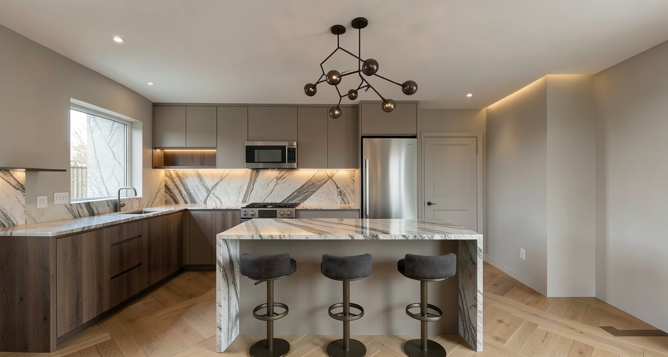 overall aesthetic warm contemporary minimalism everything is texture and proportion cabinetry base cabinet flat front handle less doors throughout dark brown shinoki oak upper cabinet warm taupe greige tone not grey not brown somewhere between open shelf at the left of the stove has the wood colour same as the base cabinet stone countertop dramatic bookmatched or large format slab grey cream marble with heavy movement island has a waterfall edge with thick profile same stone used for backsplash on the stove wall sink side does not have stone backsplash flooring wide plank herringbone hardwood warm honey light oak tone matte finish medium width planks fixtures square angular matte bronze or gunmetal faucet minimal spout 90 geometry appliance is stainless steel subtle under cabinet or recessed puck lighting color palette for rendering cabinetry warm greige ncs s 5010 y50r or benjamin moore rockport gray range floor warm light oak metal dark bronze antique brass matte decor and fill the room over the countert cabinet at the sink is black aluminum framed glass door with glass shelf inside and led lights inside