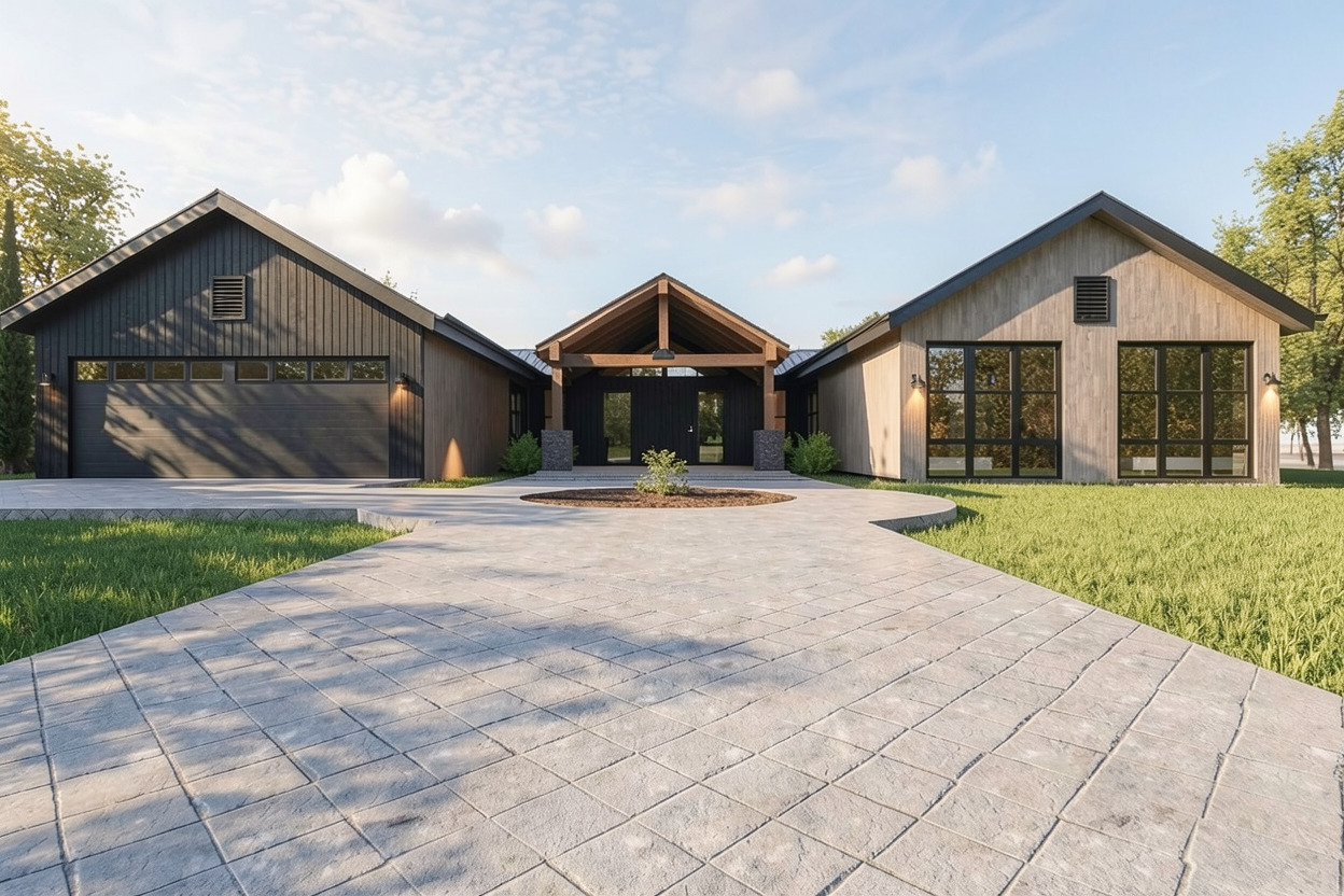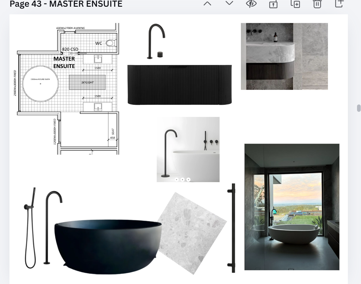 create a high end architectural render based strictly on the attached master ensuite floorplan and mood board do not alter layout wall positions skylight placement window openings bath position vanity locations or wc placement maintain exact proportions from plan layout requirements large round freestanding bath positioned on the left side as per plan rectangular skylight centred above bath double vanity opposite bath floating design separate wc behind sliding cavity door as shown in plan shower area as per floorplan configuration materials finishes floor large format light grey stone tile minimal grout lines matte finish walls grey stone tile floor to ceiling for a seamless spa look vanity floating curved black fluted vanity ribbed texture matte finish vanity top light grey marble or stone with subtle veining basins integrated or sculptural stone basins bath matte black round freestanding bath as per mood board all tapware fixtures matte black shower black ceiling mounted rain head and matching hand shower door hardware matte black minimal bar handle lighting atmosphere strong natural light entering from skylight above bath soft indirect lighting under vanity moody architectural shadows similar to modern luxury spa bathroom overall mood modern masculine calm dramatic but minimal clean lines no clutter no decorative styling high end architectural visualisation with realistic textures and soft shadows