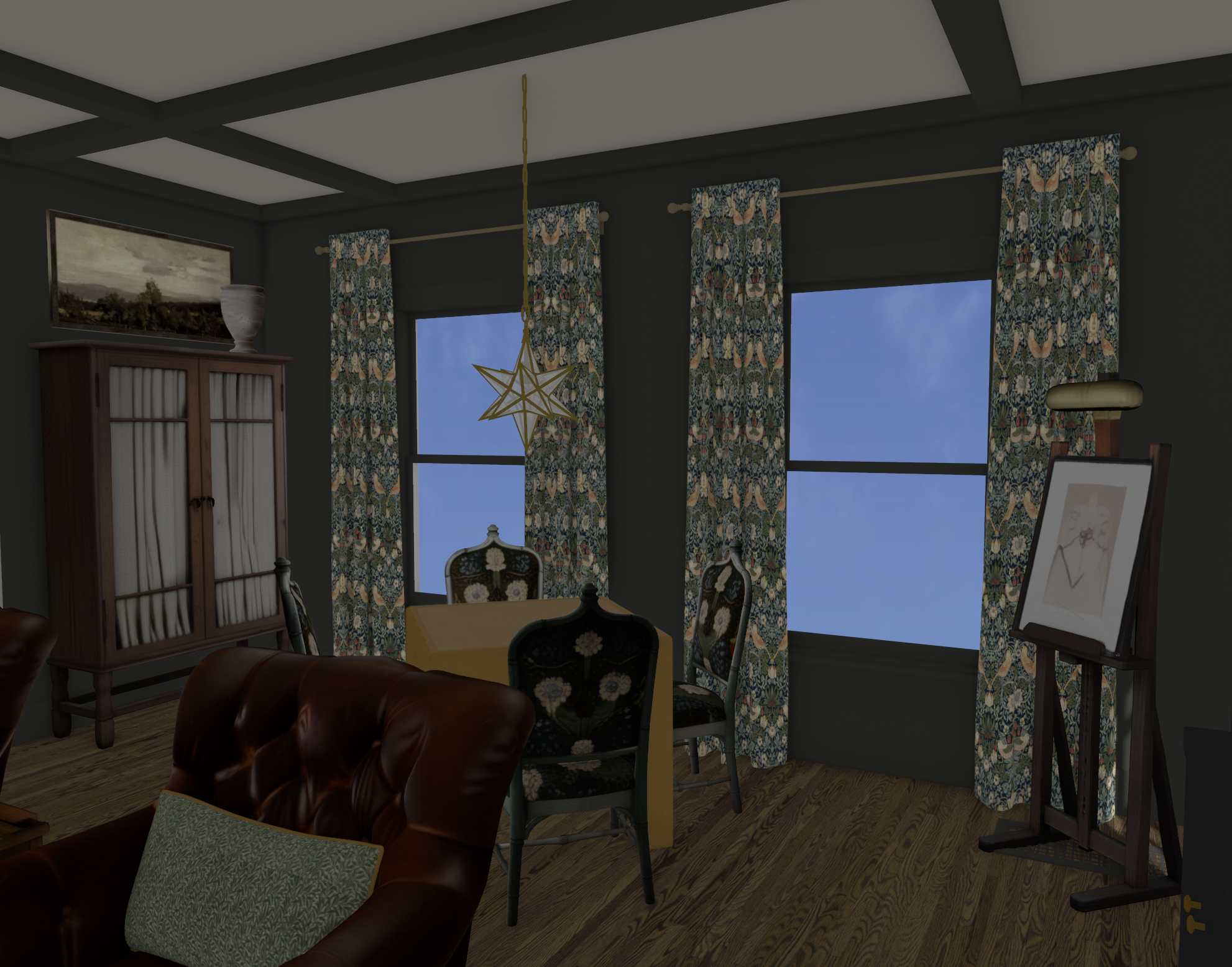 make as lifelike as possible colors and patterns need to be bold and saturated maintain colors add evening sunlight coming in but not too orange add small pothos plant on the edge of the wooden cabinet with part of the plant draping down one edge turn on lights add chess set to the table