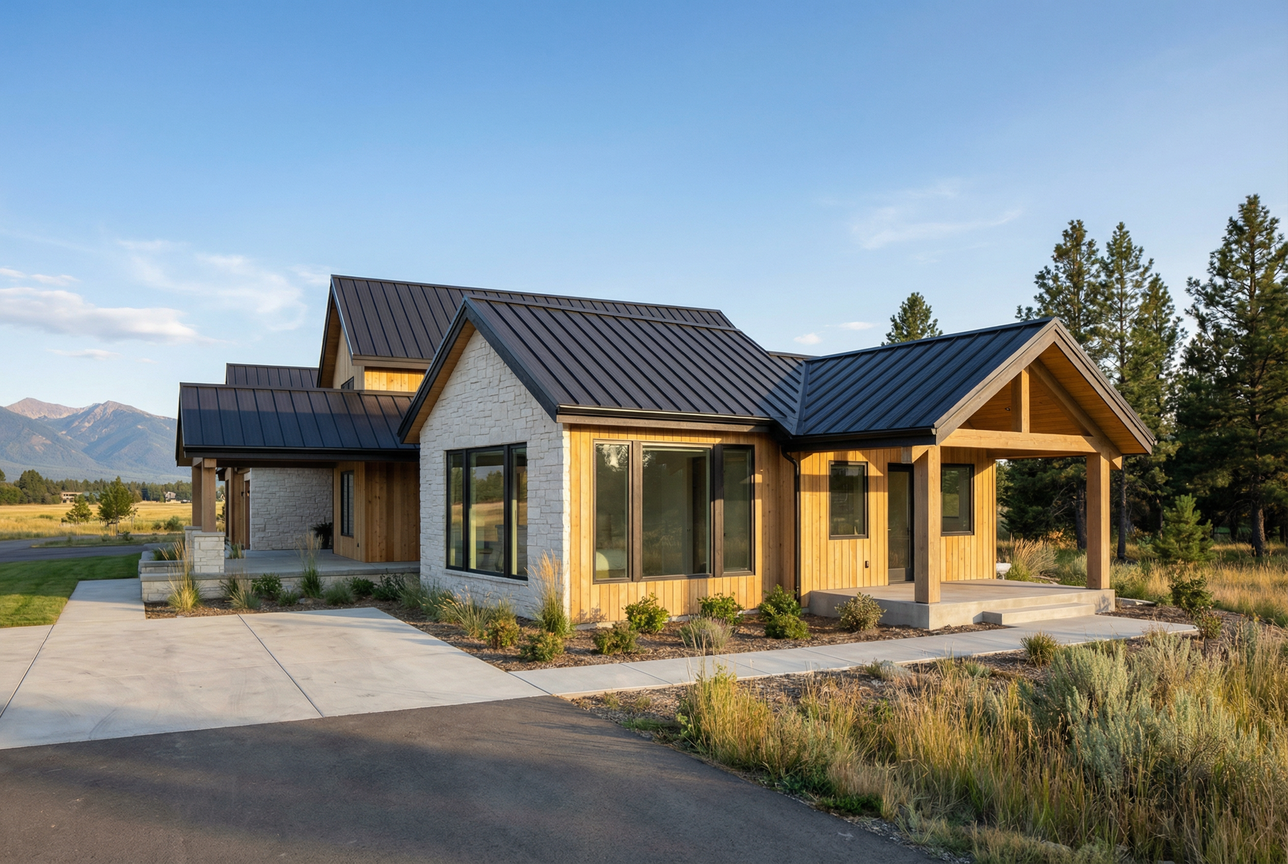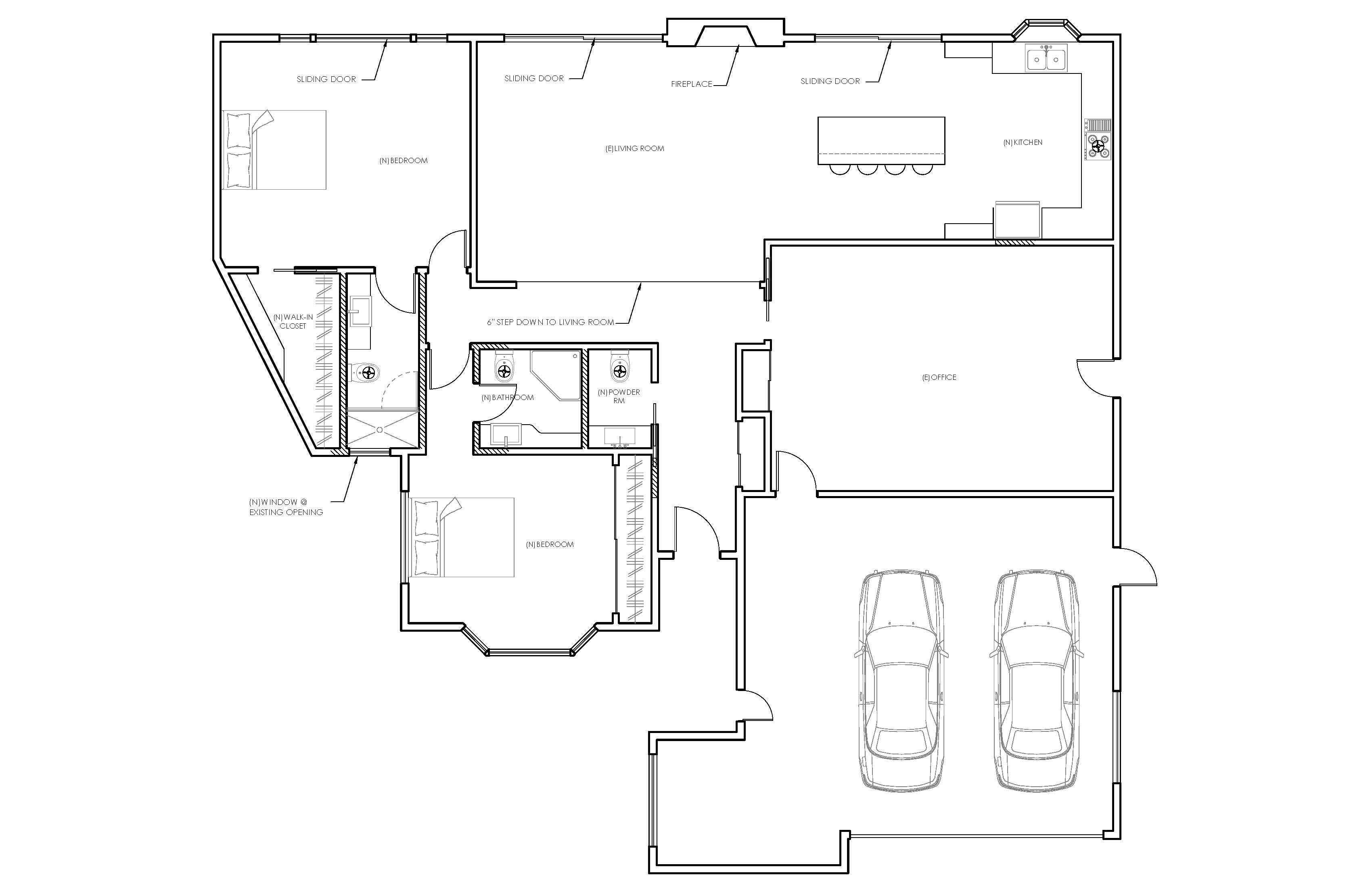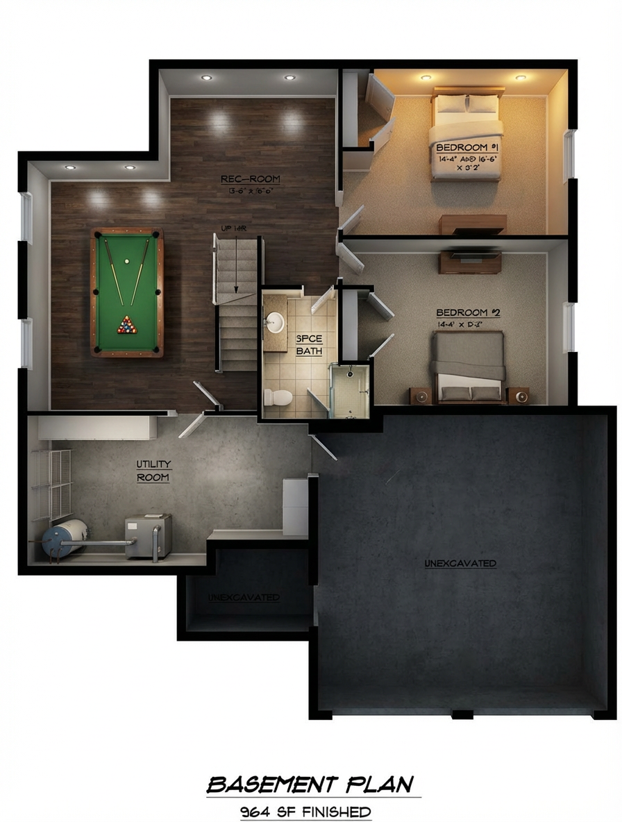 convert this floor plan into a realistic isometric 3d view of a full house show the space from an elevated angle with furniture walls and details visible beige grey laminate flooring in bedrooms living room kitchen and office concrete floor in garage grey beige modern furniture brick fireplace noting outside the house only simple white surface use the same furniture as shows on the plan do not change the orientation of the floorplan