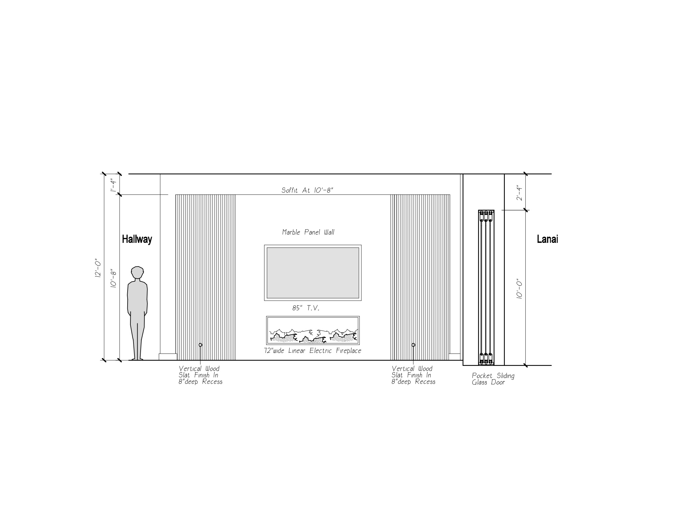 light brown wood slat wall light gray marble finish behind tv and fireplace light gray floor beach scene on tv