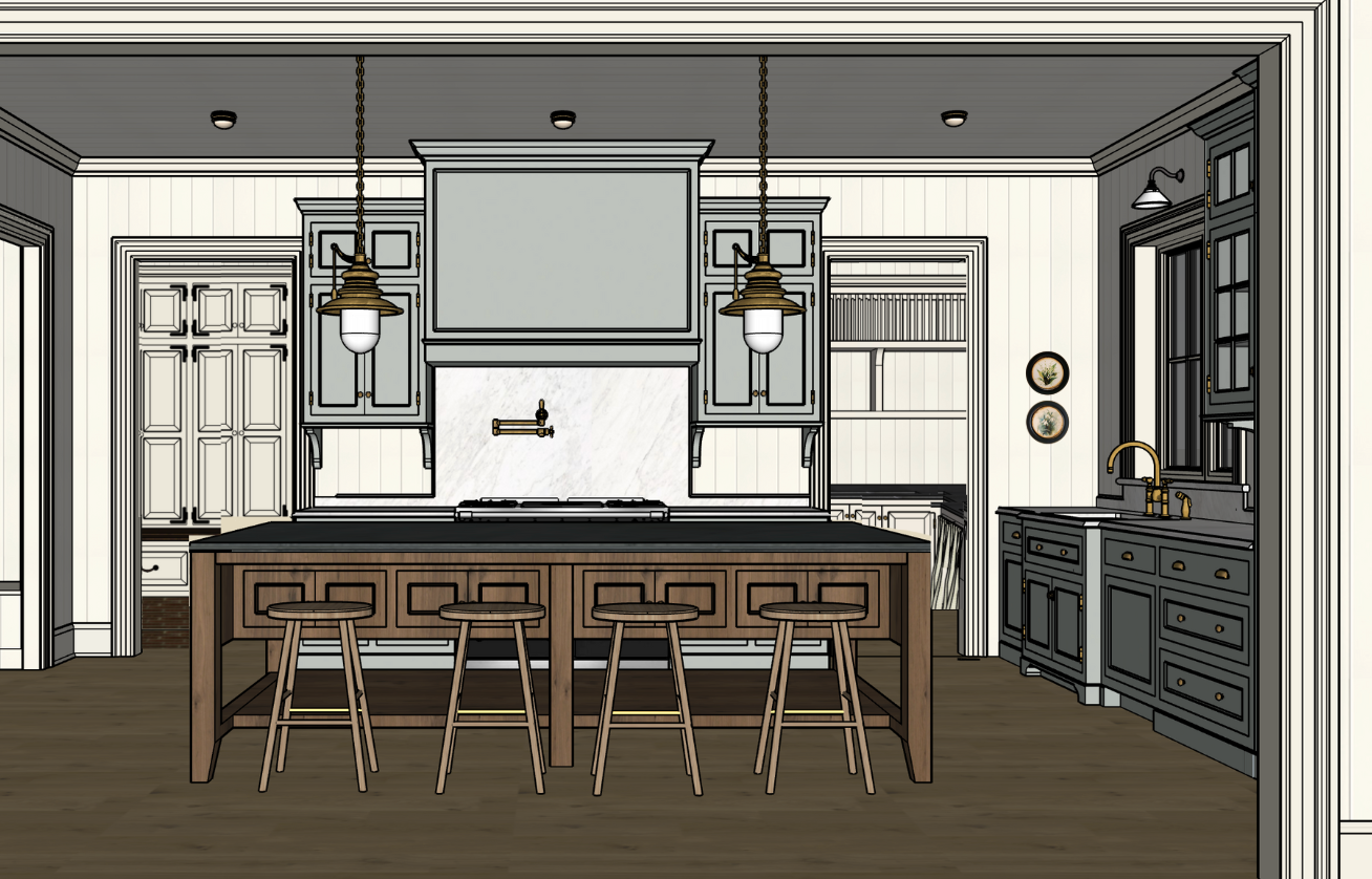 create a realistic rendering of this sketchup model maintain all existing colors materials finishes and furnishings exactly as shown use natural lighting that highlights textures and depth render at high resolution with realistic shadows reflections and accurate material lighting wood grain stone veining metal sheen fabric texture etc do not change the design palette or layout only enhance realism and lighting quality add in soft lighting coming in from the left side of the image