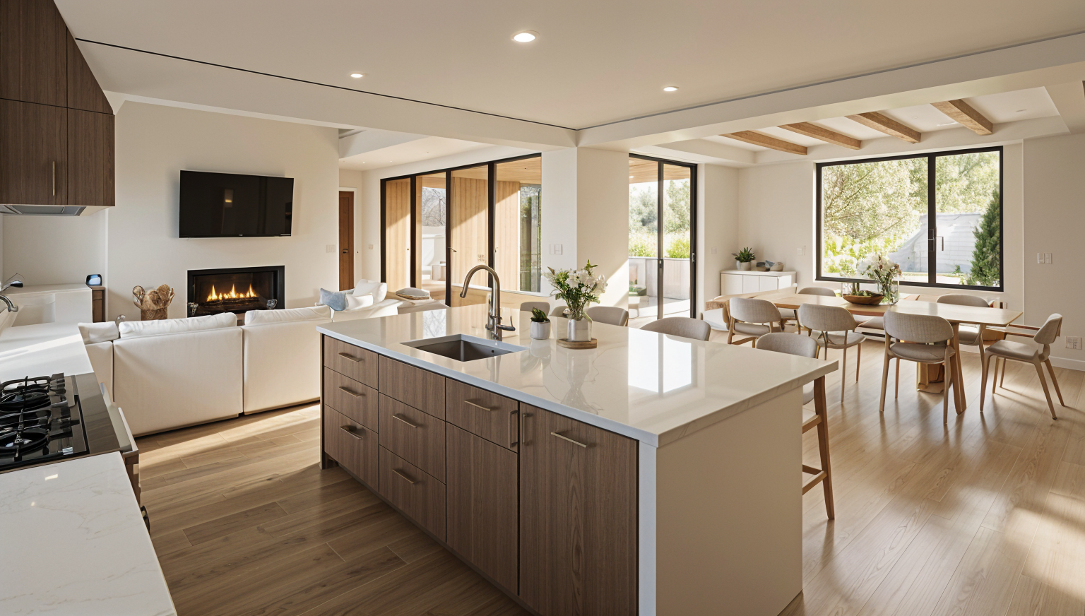 add real material and appliances to the kitchen island but no wood on the couch beyond