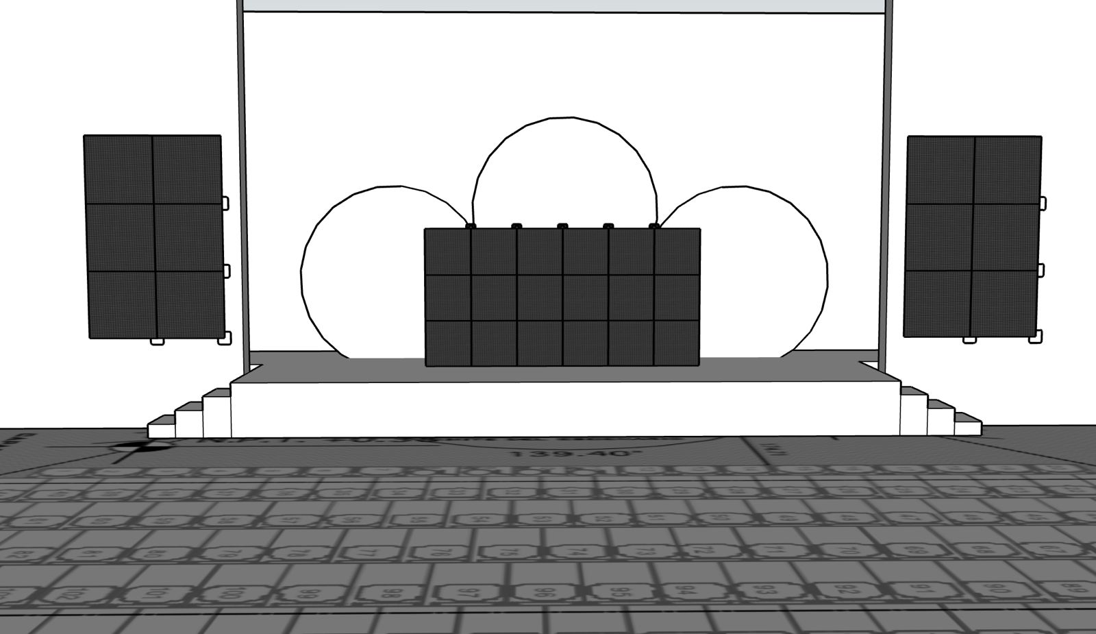 hyper realistic illustration of a theater stage setup the floor is filled with audience seats arranged in rows like a classic theater auditorium at the center there is a stage with a scenography inspired by rokam three circular background panels one large in the middle two smaller on the sides and a stack of black speakers in front on both sides of the stage tall speaker towers are placed the perspective is from the audience view showing the seating area in the foreground and the full stage setup in detail with realistic lighting and textures architecture