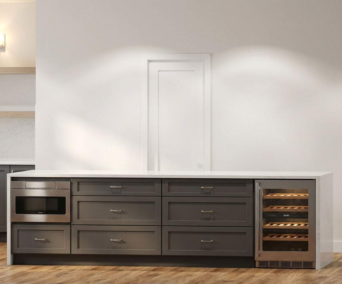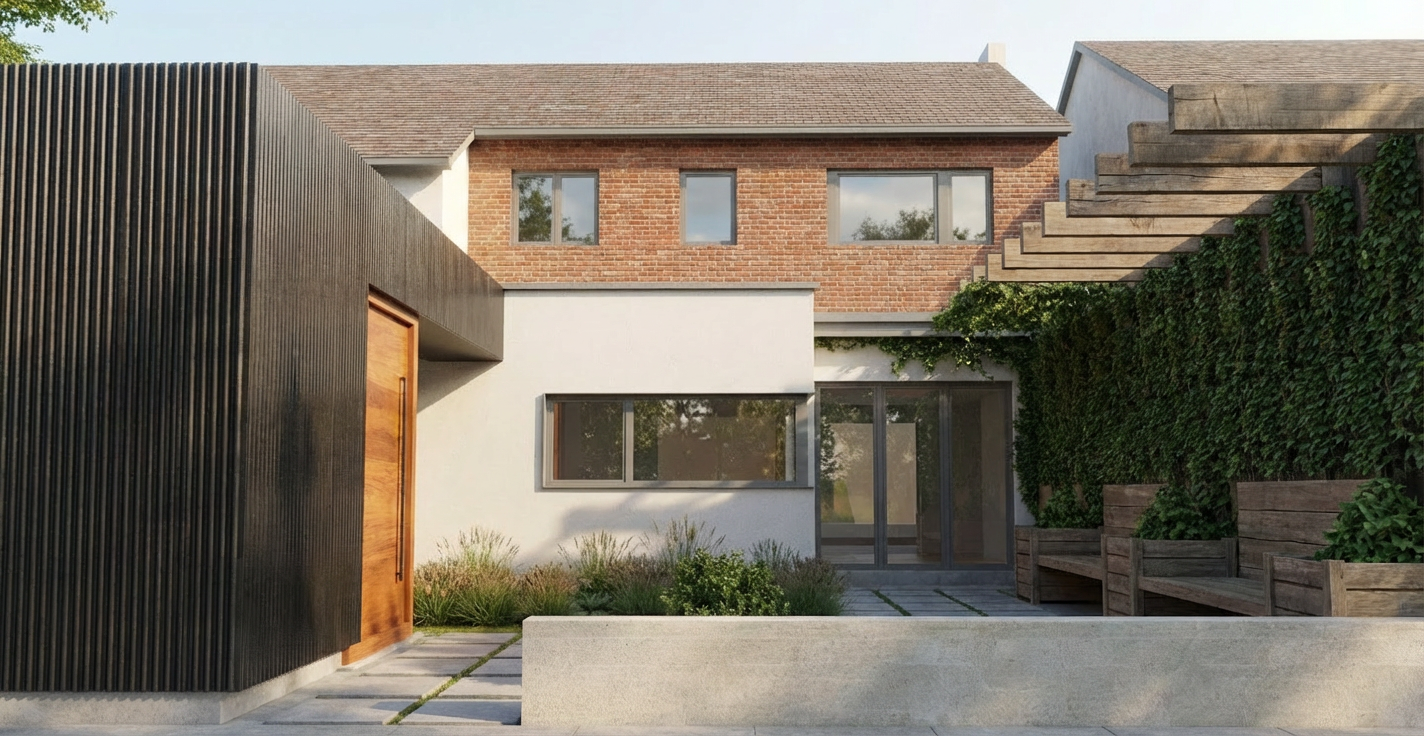 a charming modern farmhouse with a pitched roof featuring soft cream siding accented with light gray stone the roof is a gentle charcoal gray adding elegance black framed windows enhance its contemporary appeal the atmosphere is serene and inviting set in a lush green landscape under a clear blue sky soft sunlight casts gentle shadows creating a warm welcoming ambiance courtyard garage