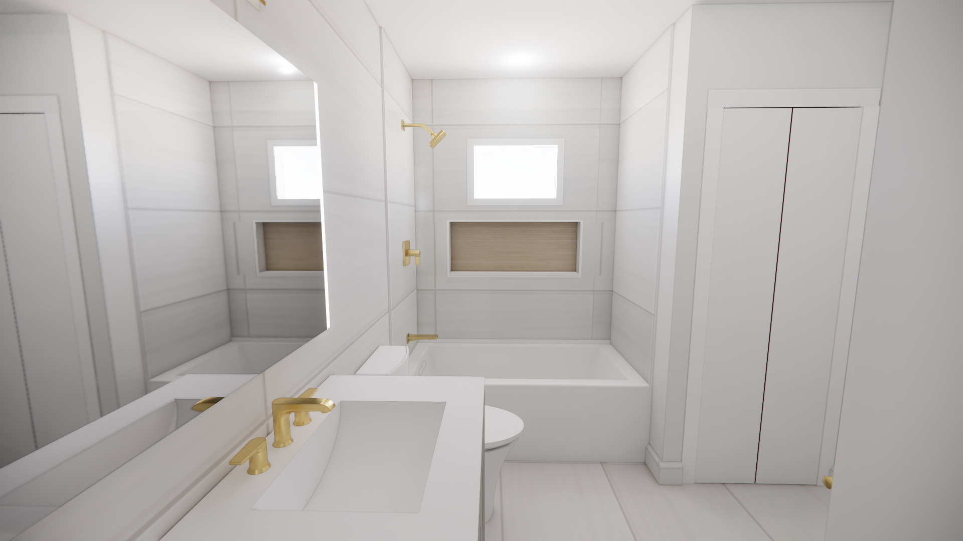 make this look like a photo realistic rendering tiles are white with very light off white gray horizontal lines you can barely see them walls with no tile are white