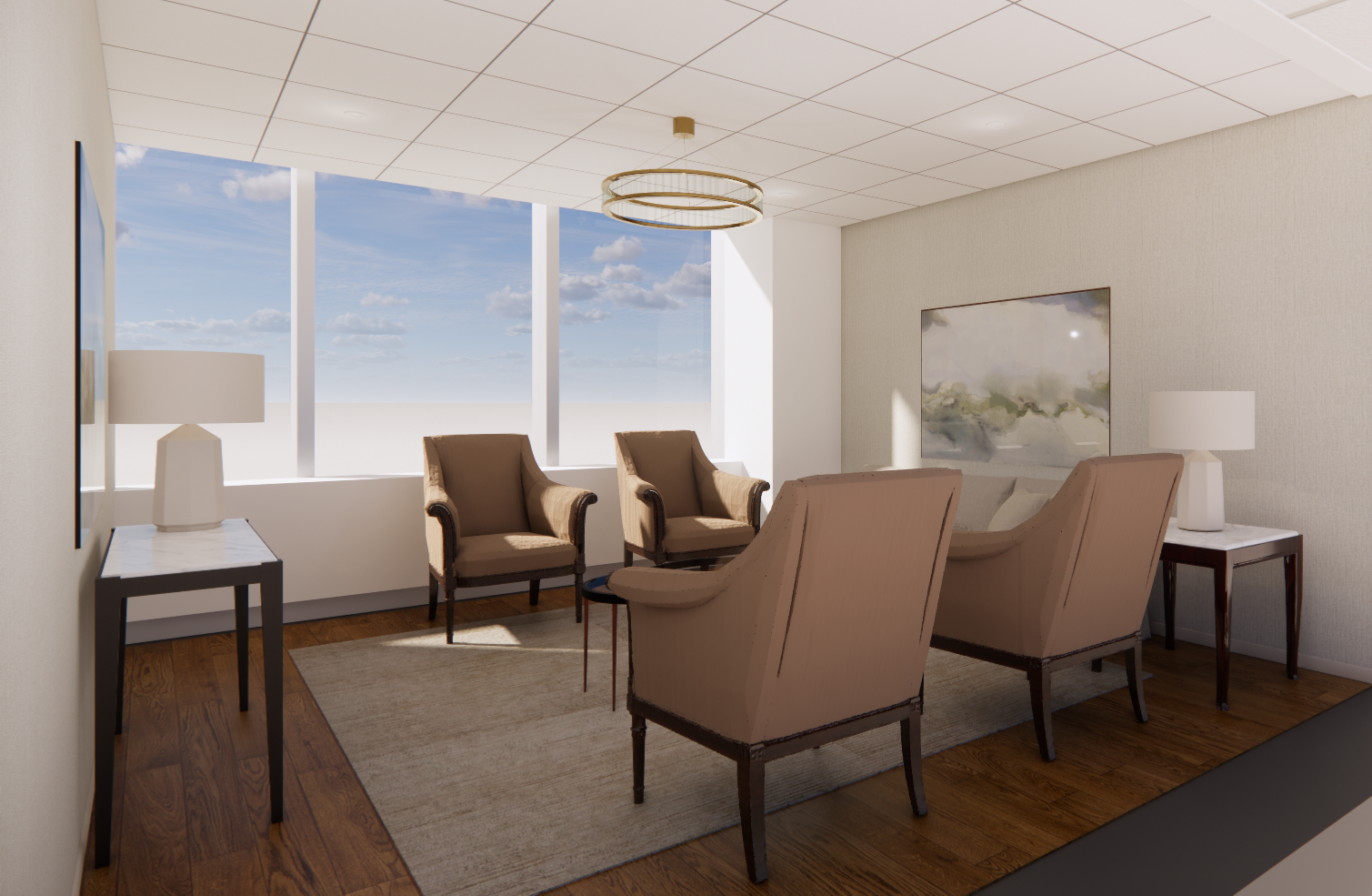 add views of midtown manhattan from 43rd floor keep all the elements and finishes as they are provide photo realistic rendering in daylight