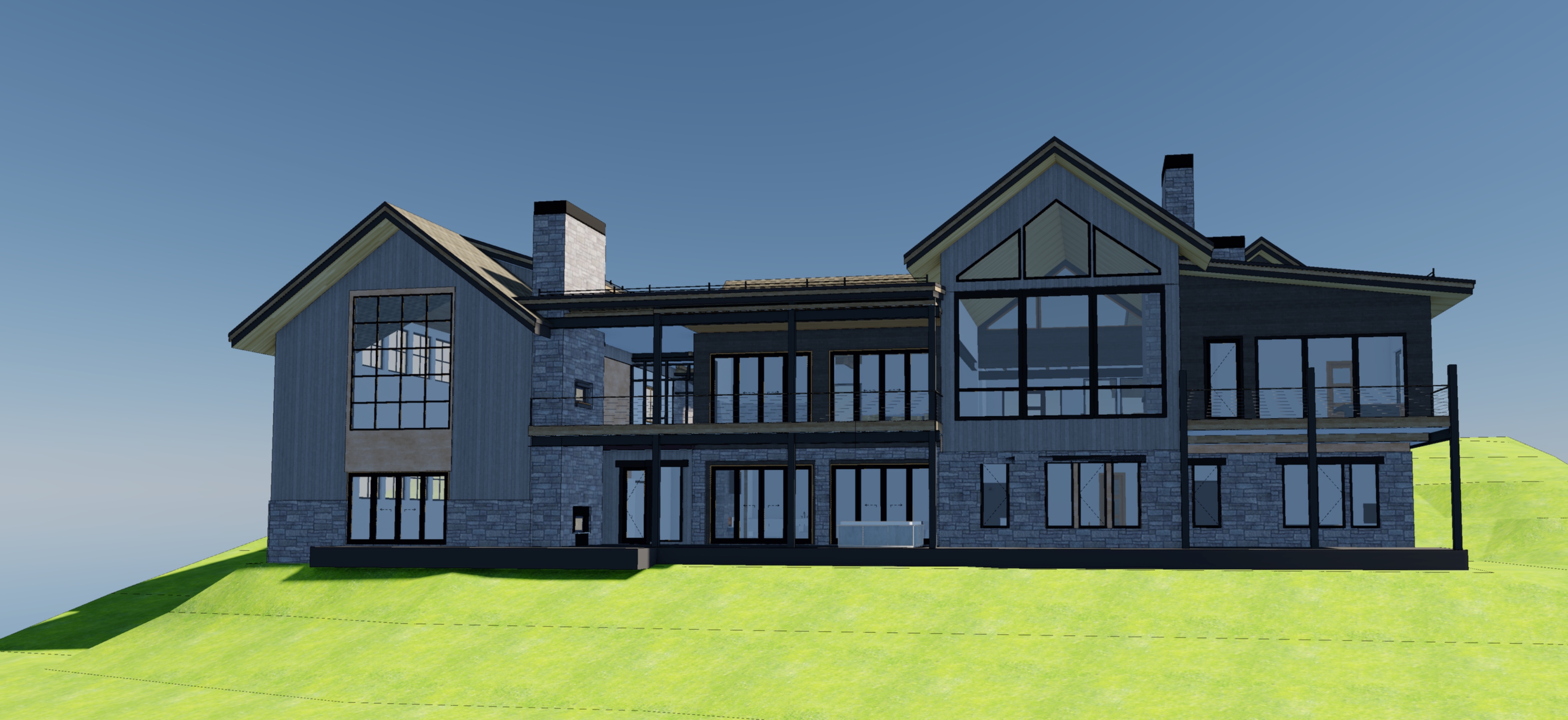 mountain modern ski home warm light emanating from the windows vertical siding brown in grey areas and horizontal siding in black areas snowy pine forest around the home and distant low mountains alpine glow from behind the camera