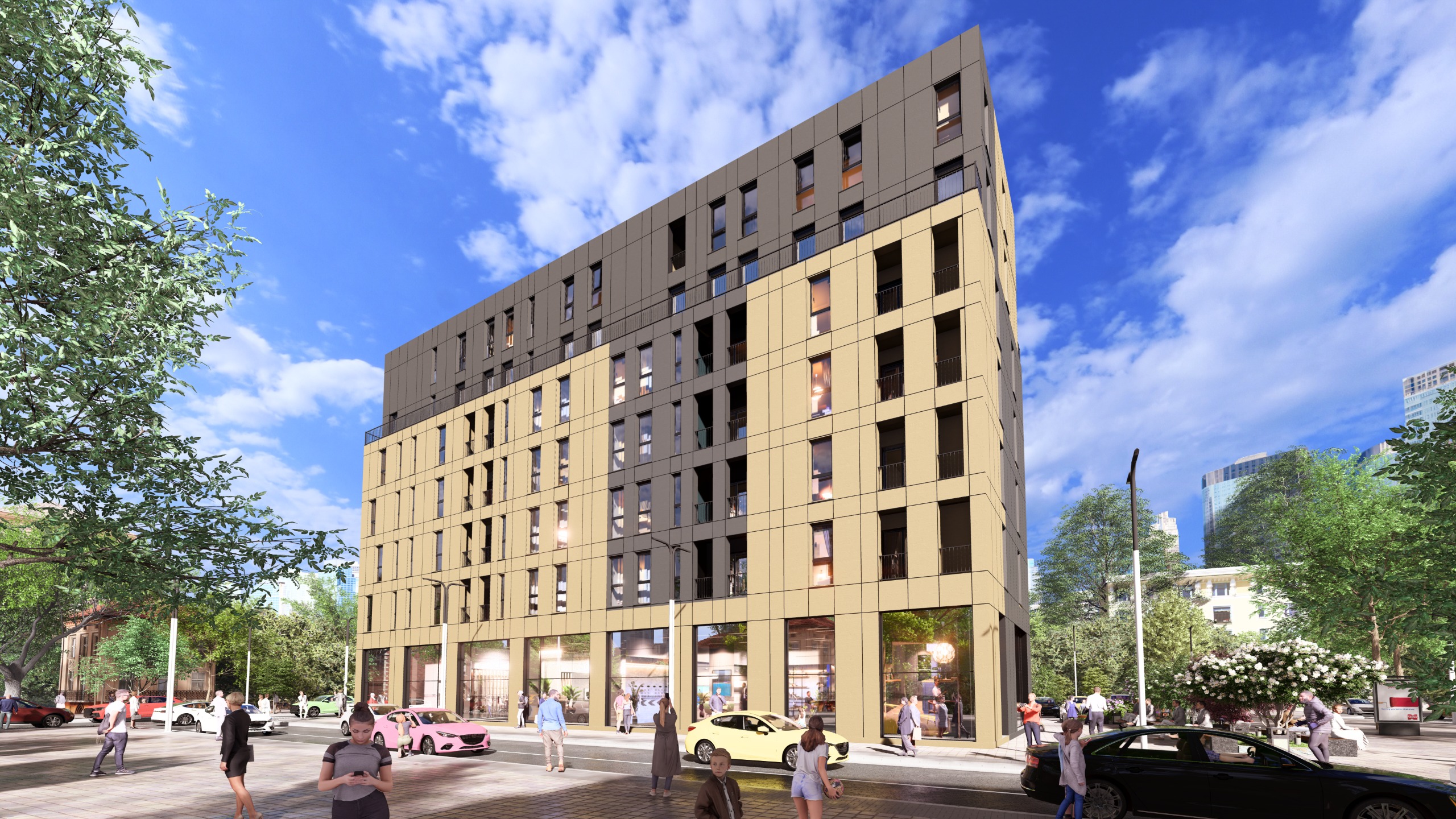 keep the colors of the building the same but with a little more contrast make the window glass more realistic make the environment around the building trees people cars look more natural