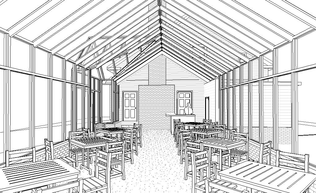 interior shot render an elegant conservatory connected to a craftsmen style house with a sophisticated and cozy atmosphere the roof and structural beams are gloss black contrasting with clear glass panels to allow natural light the main house exterior is white clapboard siding with cream yellow trim exuding a classic charm surrounding the conservatory lush green lawn and foliage adds a touch of nature the interior features warm rustic wooden furniture in natural oak tones basking in the golden glow of the afternoon the sky is a blend of vibrant blues creating a calming and welcoming ambiance people sit at the tables with their families eating their meals while a cashier helps customers at the counter