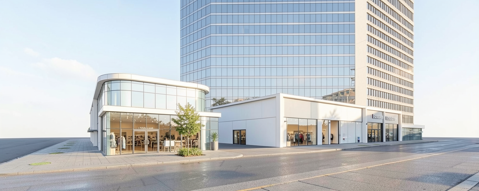 architecture rendering of a classic building with a symmetrical facade the main building structure is made of red bricks the left module of the building is modern having facade of metallic panels the triangular rooftops are topped with dark slate tiles windows are adorned with black iron grilles the doors are crafted from rich mahogany wood surrounding the building is a lush green landscape with vibrant colorful flowers such as roses and lavender in the garden the atmosphere is serene and elegant set under a clear blue sky with soft golden sunlight illuminating the structure casting gentle shadows